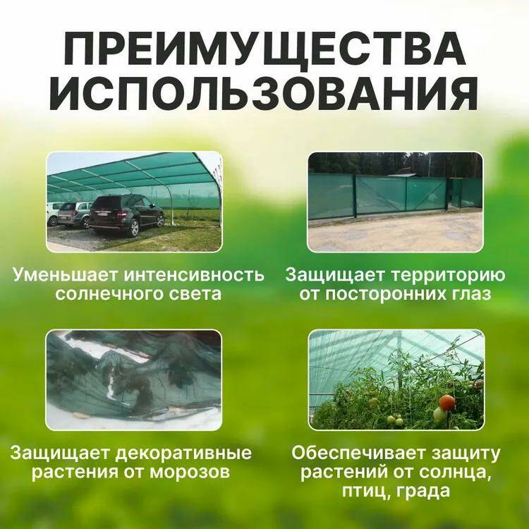 Декоративная темно-зеленая сетка защищает не только от яркого солнечного света и попадания ультрафиолета, но и от различных насекомых, птиц, листвы. Сетка затеняющая фасадная используется для затенения дачных и садовых построек: беседок, детских площадок, теплиц, навесов для автомобиля, создания ограждений и заборов. Сетчатое покрытие уменьшает УФ-излучение, тем самым предотвращает пересыхание почвы, увядание листьев, порчу плодов.