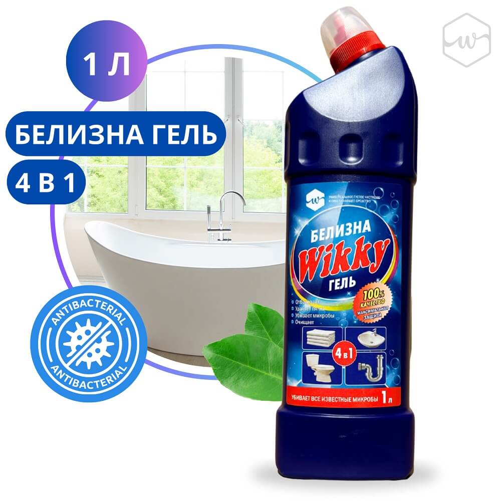 Моет, отбеливает и дезинфецирует посуду, пластик, кафель, ванны, раковины,унитазы, мусорные ведра.