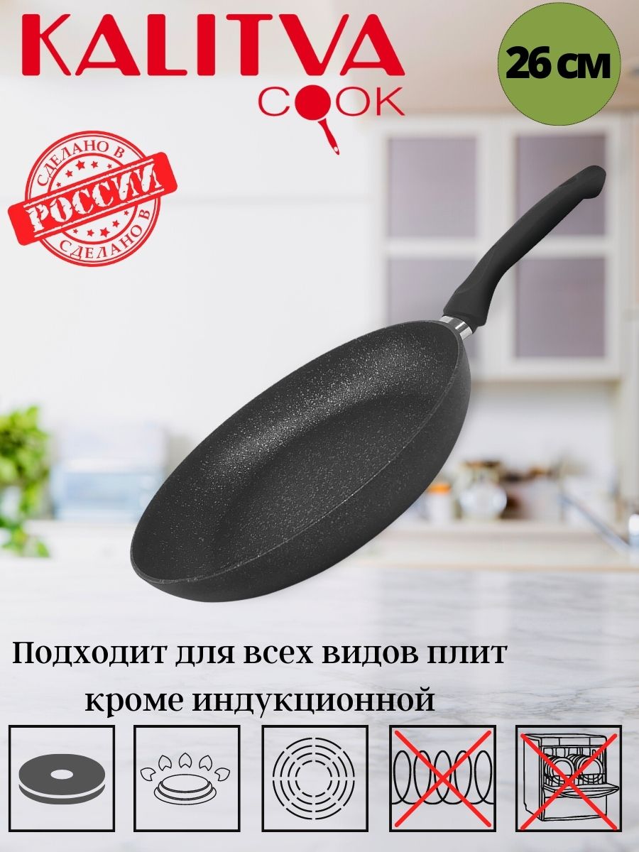 Модель совместима со стеклянными крышками всех линеек антипригарной посуды бренда Калитва и идеально подходит для жарки рыбы, мяса и овощей, гарниров, полуфабрикатов.