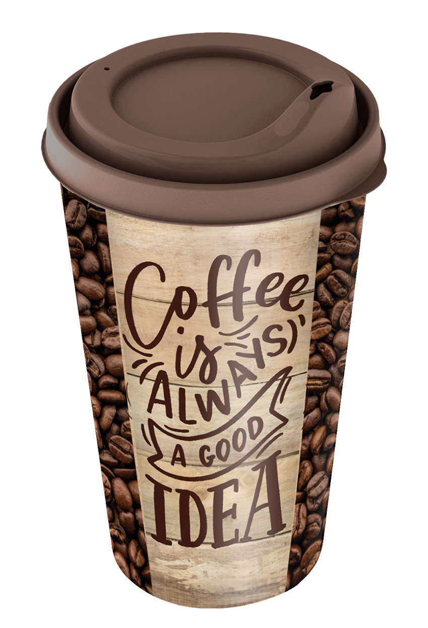 Стаканы 550 мл с крышкой имеют комфортный диаметр корпуса, удобно ложатся в руку и подходят к подстаканникам в машине. Крышка с носиком имеет язычок для удобного открывания. Использование многоразовых стаканов и кружек для напитков вместо одноразовых не только полезно для экологии, но и делает более приятным приём напитка. IML-декор наносится на весь корпус и вплавляется в изделие на этапе литья, поэтому он не стирается и долго радует глаз. Качественный полипропилен не содержит бисфенола А и подходит для СВЧ.