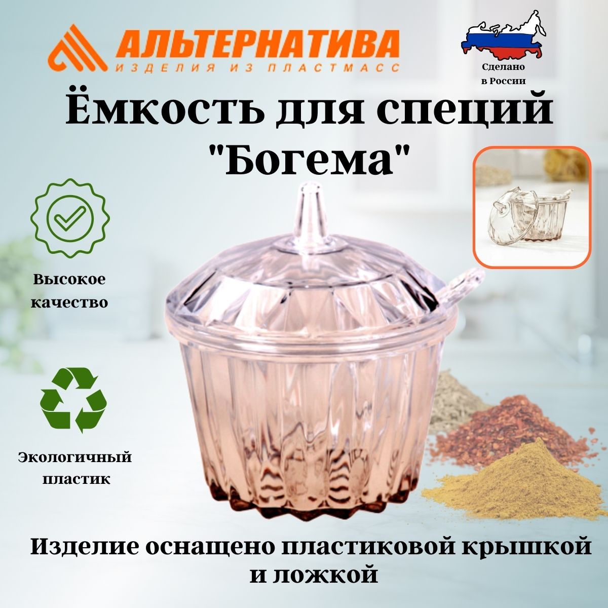 Изделие выполнено из высококачественной пластмассы. Ёмкость для специй из серии «Богема» привлечет внимание и создаст атмосферу праздника на кухне. Изделие оснащено пластиковой крышкой и ложкой. Ёмкость для специй прозрачна, что без труда поможет найти нужную пряность. Отлично подходит для подачи специй, соусов и даже варенья. Такая ёмкость подходит для сервировки стола и станет незаменимым помощником в хранении продуктов. Также данное изделие можно дополнить сахарницей и салатником из серии «Богема». Изделие рекомендуется мыть тёплой водой с применением нейтральных моющих средств.