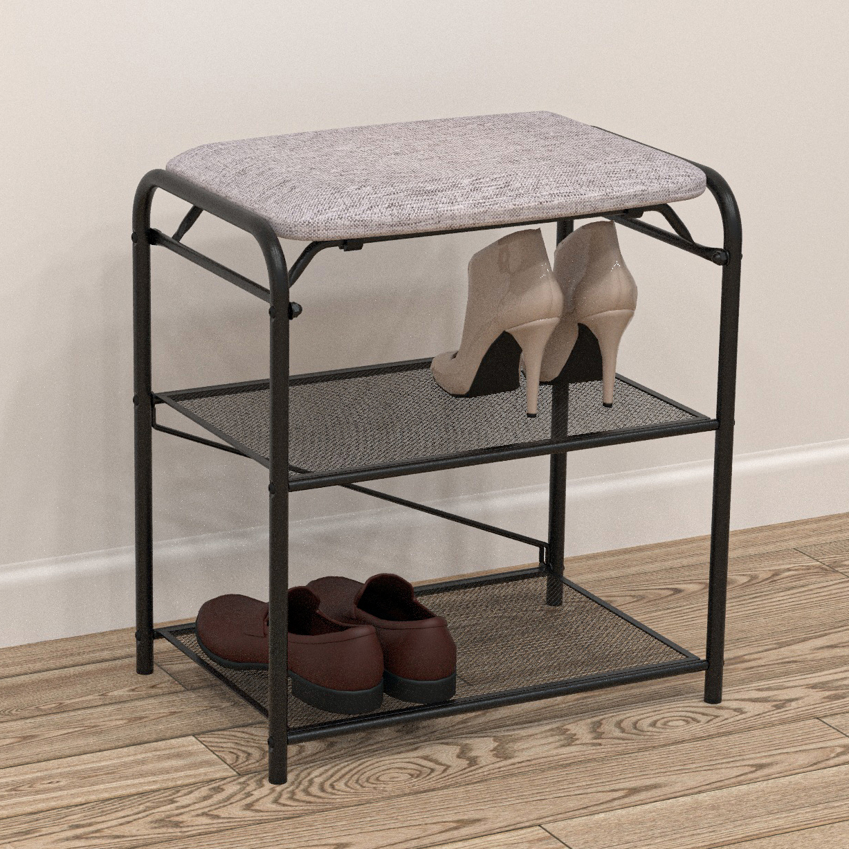 Долговечная, благодаря каркасу и полкам из стали. Две полки вместят до 4 пар обуви, а продуманные расстояния между ними позволят разместить как летнюю, так и зимнюю обувь.