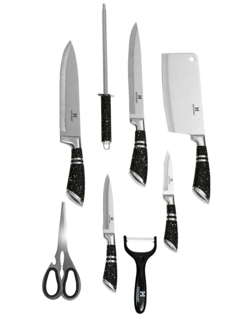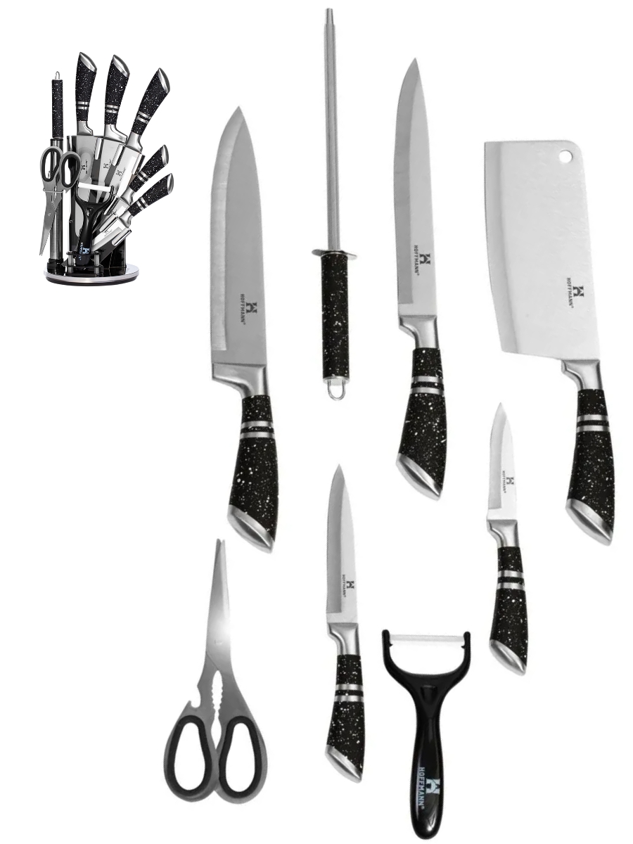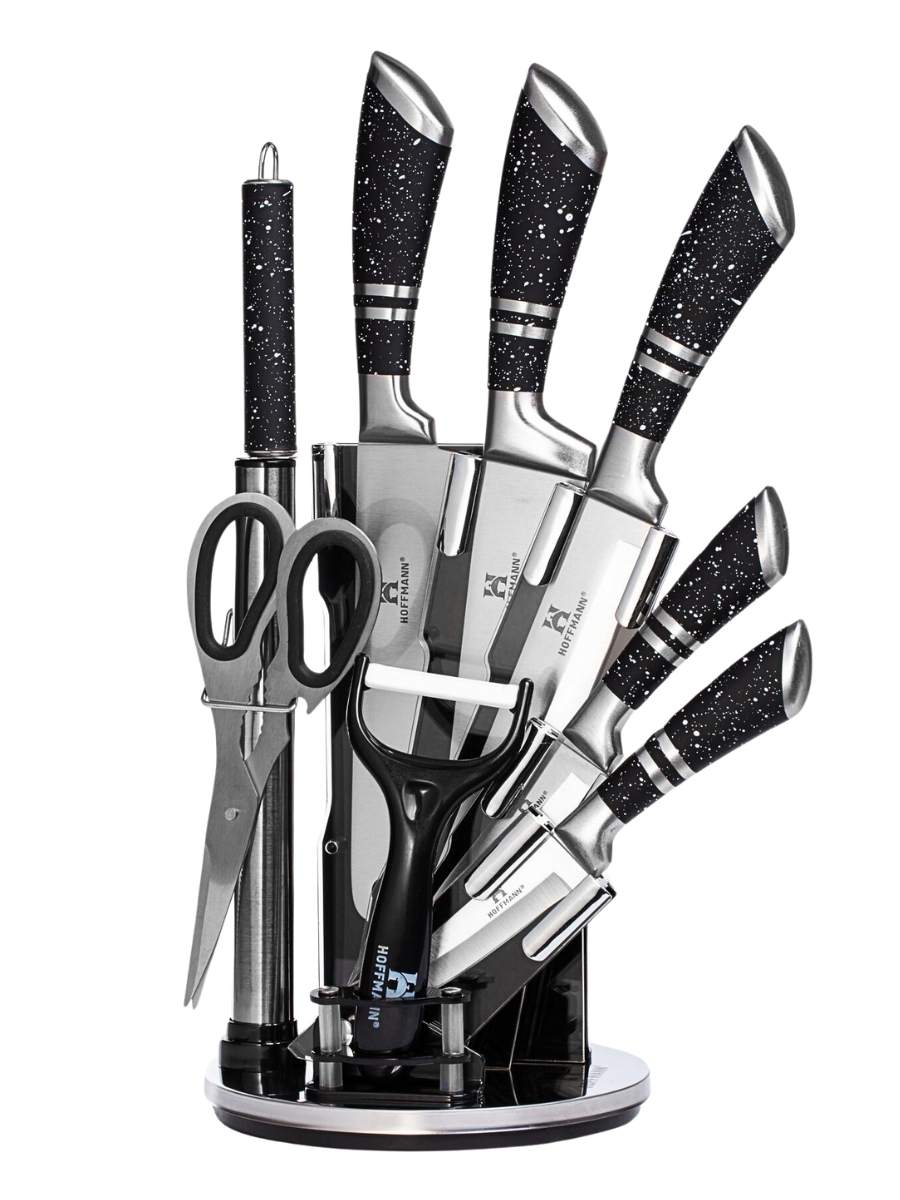 Набор ножей 9пр, поварской нож, нож для хлеба, нож для нарезки, универсальный нож, нож для чистки овощей и фруктов, керамический пиллер, крутящаяся акриловая подставка, цвет: Черный с точками