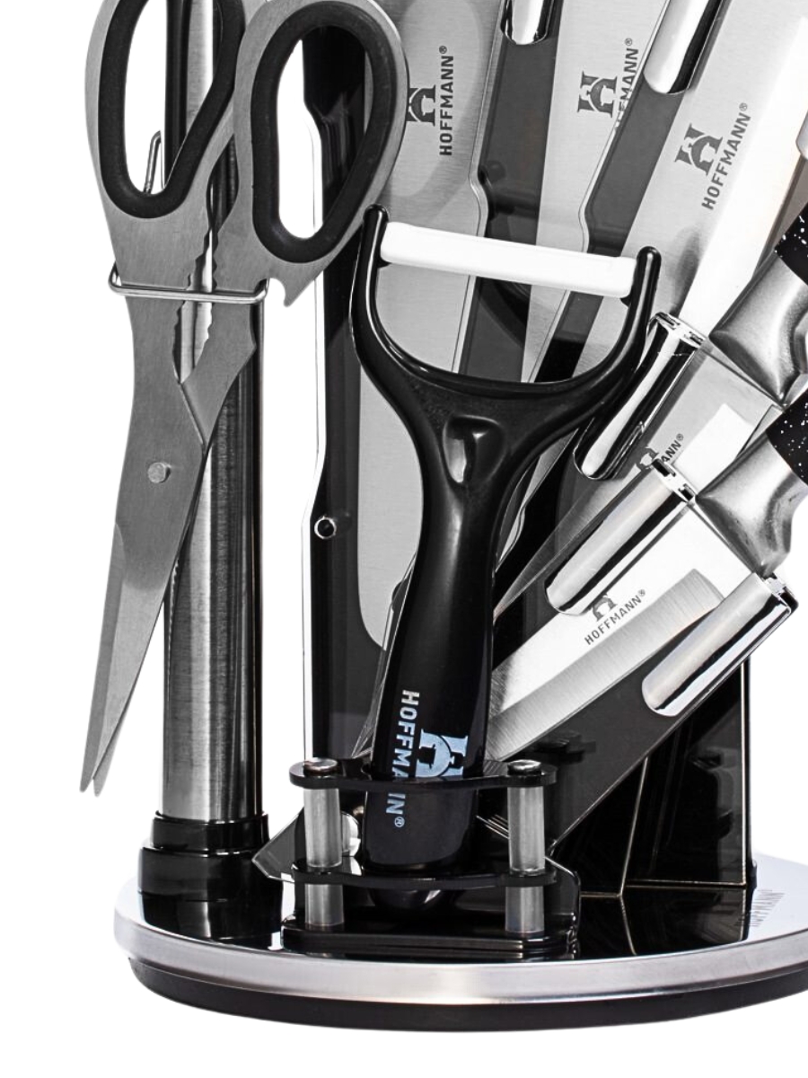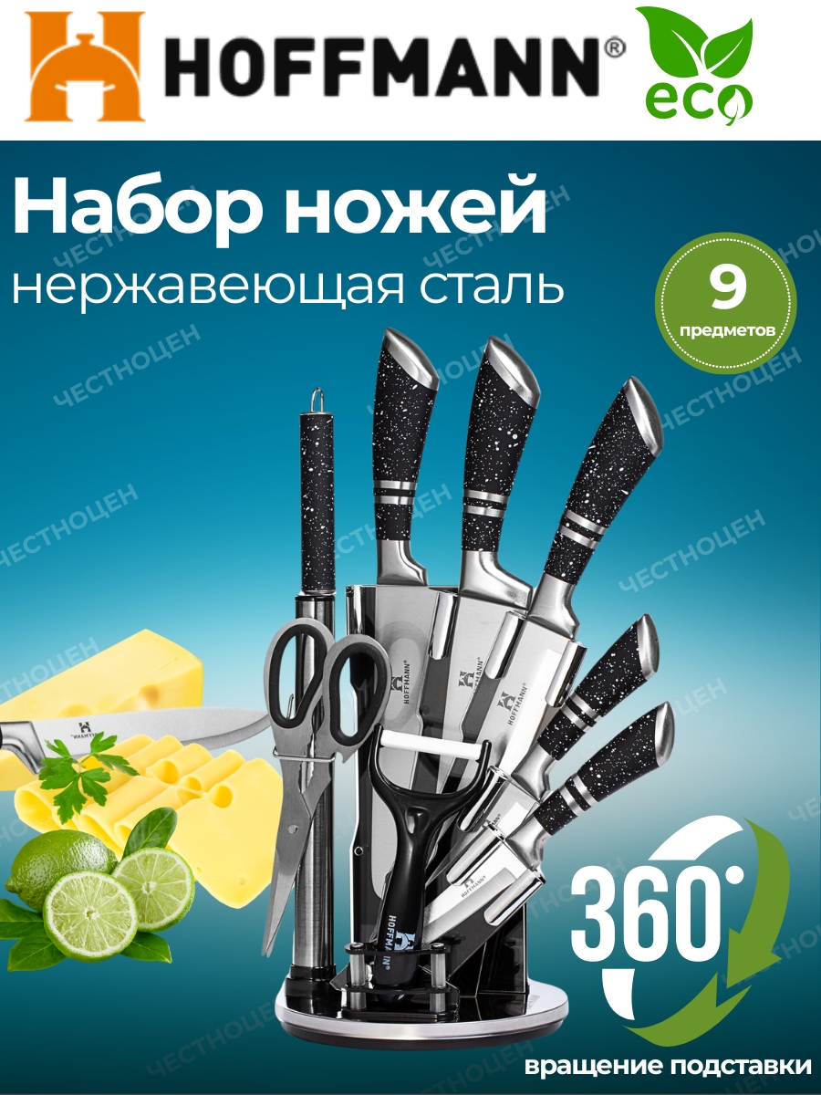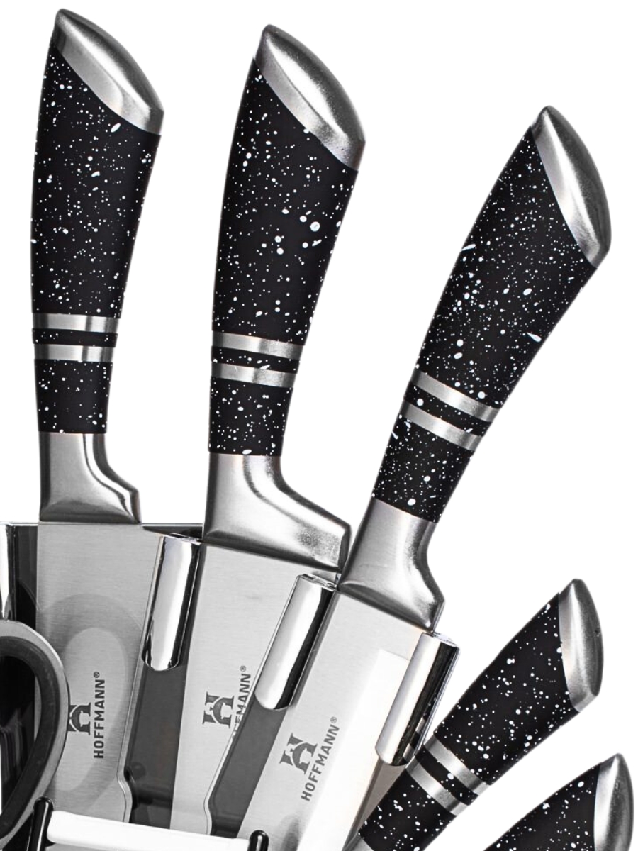 Набор ножей 9пр, поварской нож, нож для хлеба, нож для нарезки, универсальный нож, нож для чистки овощей и фруктов, керамический пиллер, крутящаяся акриловая подставка, цвет: Черный с точками