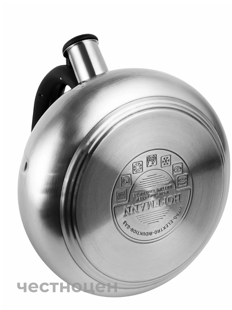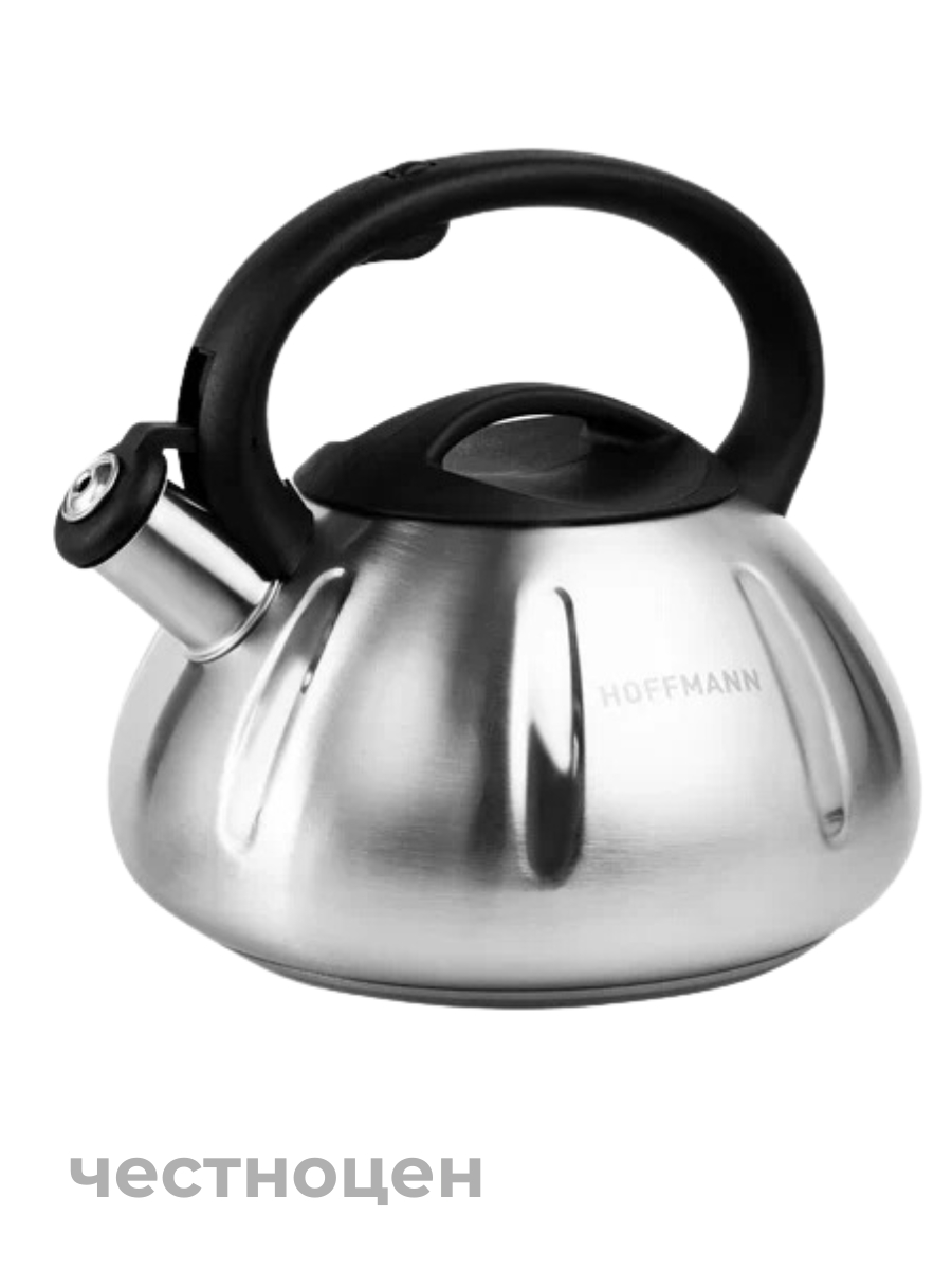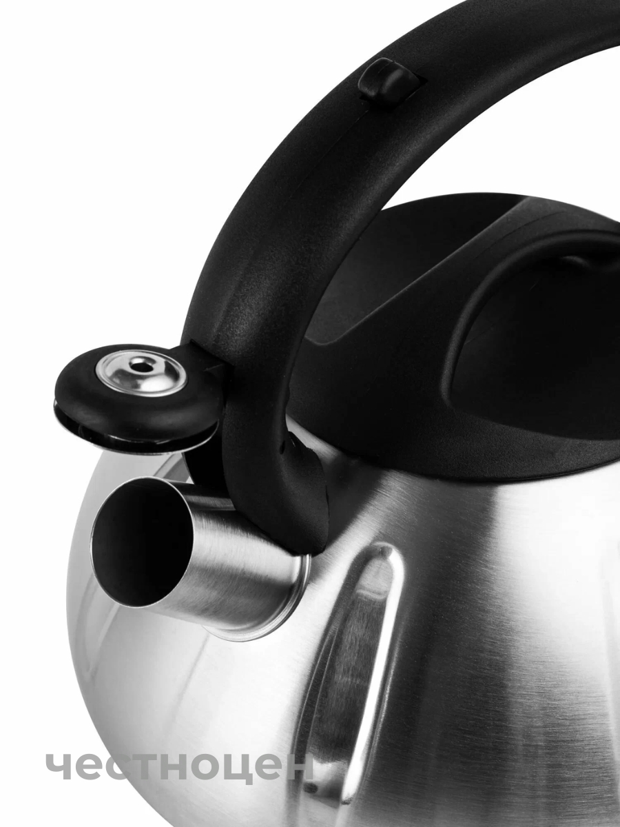 Чайник со свистком 3,0 л; нержавеющая сталь 0,6 мм.; 3-х слойное термоаккумулирующее капсулированное дно (технология сендвич, алюминиевая пластина); неподвижная черная ручка, съемная крышка. Подходит для всех видов плит.