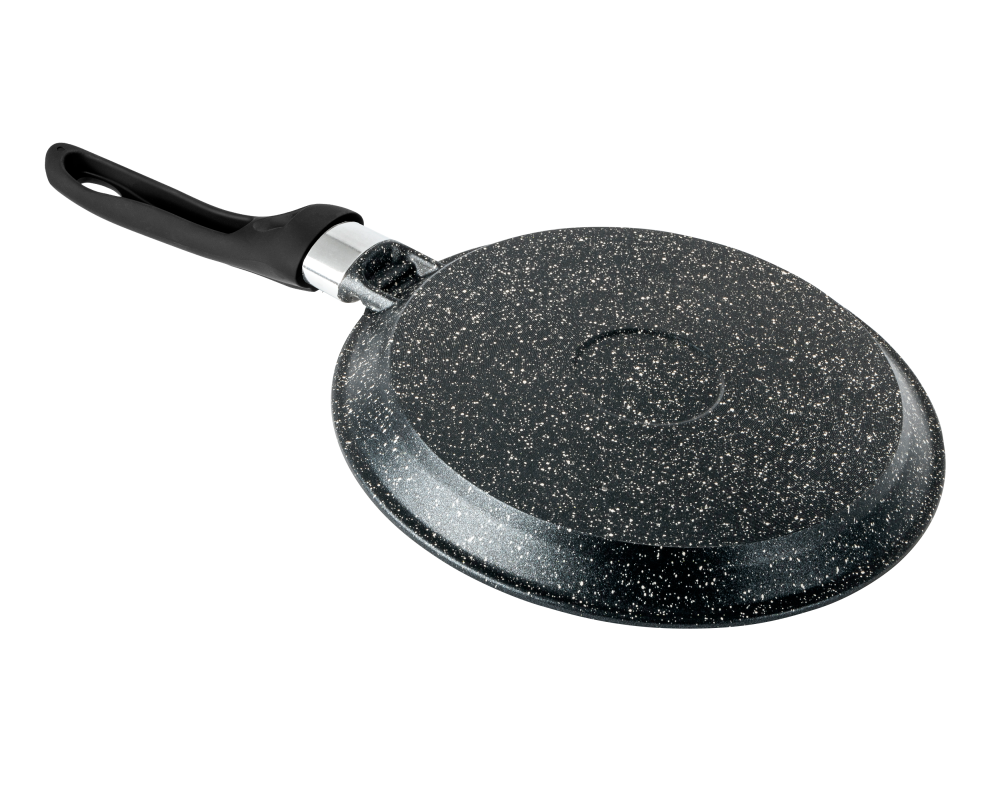 Блинная сковорода с антипригарным покрытием – литая алюминиевая посуда, которая подходит для газовых, электрических и стеклокерамических плит. При минимальном использовании масла получаются тонкие блины и пышные оладьи. «Гранит». Коллекция «мраморной посуды» с улучшенным четырёхслойным антипригарным покрытием. Дополнительный слой с мраморным эффектом увеличивает износостойкость и создаёт оригинальный оттенок чёрного мрамора. Литой пищевой алюминий - без канцерогенных веществ и посторонних запахов. Материал долговечный, не поддается деформации. Толстые стенки и утолщенное дно обеспечивают равномерное распределение тепла. Процесс готовки может протекать без добавления масла. Гладкая поверхность — залог легкого мытья как вручную, так и в посудомоечной машине. Эргономичные ручки сковородок из бакелита не нагреваются, а благодаря покрытию софт-тач не выскальзывают из рук.
