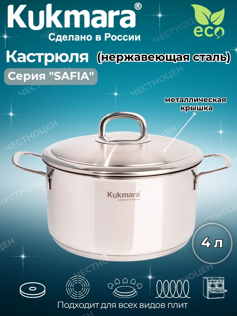 Линия посуды из нержавеющей стали Kukmara предназначена для тех, кто ценит безупречное качество и является сторонником приготовления здоровой пищи.Кастрюля хорошо подходит для варки, тушения и томления, и блюда в ней получаются сочными и ароматными. Яркая коллекция Safia придется по душе тем, кто любит окружать себя функциональными, но при этом стильными и актуальными предметами.Посуда имеет плоское, утолщенное дно, состоящее из 3-х слоев металла: индукционного, термоаккумулирующего и проводящего, которое равномерно распределяет тепло и препятствует подгоранию пищи. Это позволяет использовать посуду на любых видах плит, в том числе индукционных и стеклокерамических. При этом сокращается время на приготовление пищи, что позволяет не только сэкономить расход электроэнергии и газа, но и сберечь немало времени и сил.