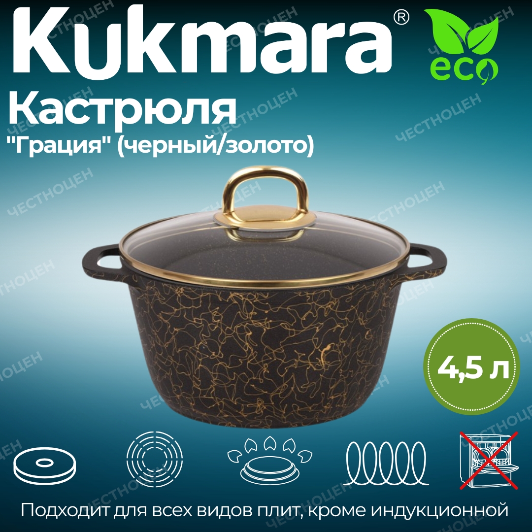 Кастрюля Kukmara хорошо подходит для варки, тушения и томления, так как имеет отличные теплораспределительные и теплоаккумулирующие свойства, и блюда в ней получаются сочными и ароматными. Цельнолитые ручки позволяют использовать кастрюлю в духовом шкафу.