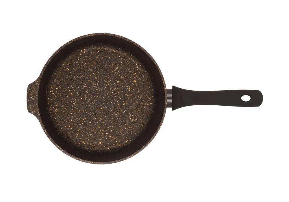 Сковорода Kukmara с антипригарным покрытием имеет проточенное дно, которое обеспечивает максимальное прилегание дна посуды к плите для более быстрого и равномерного нагрева.