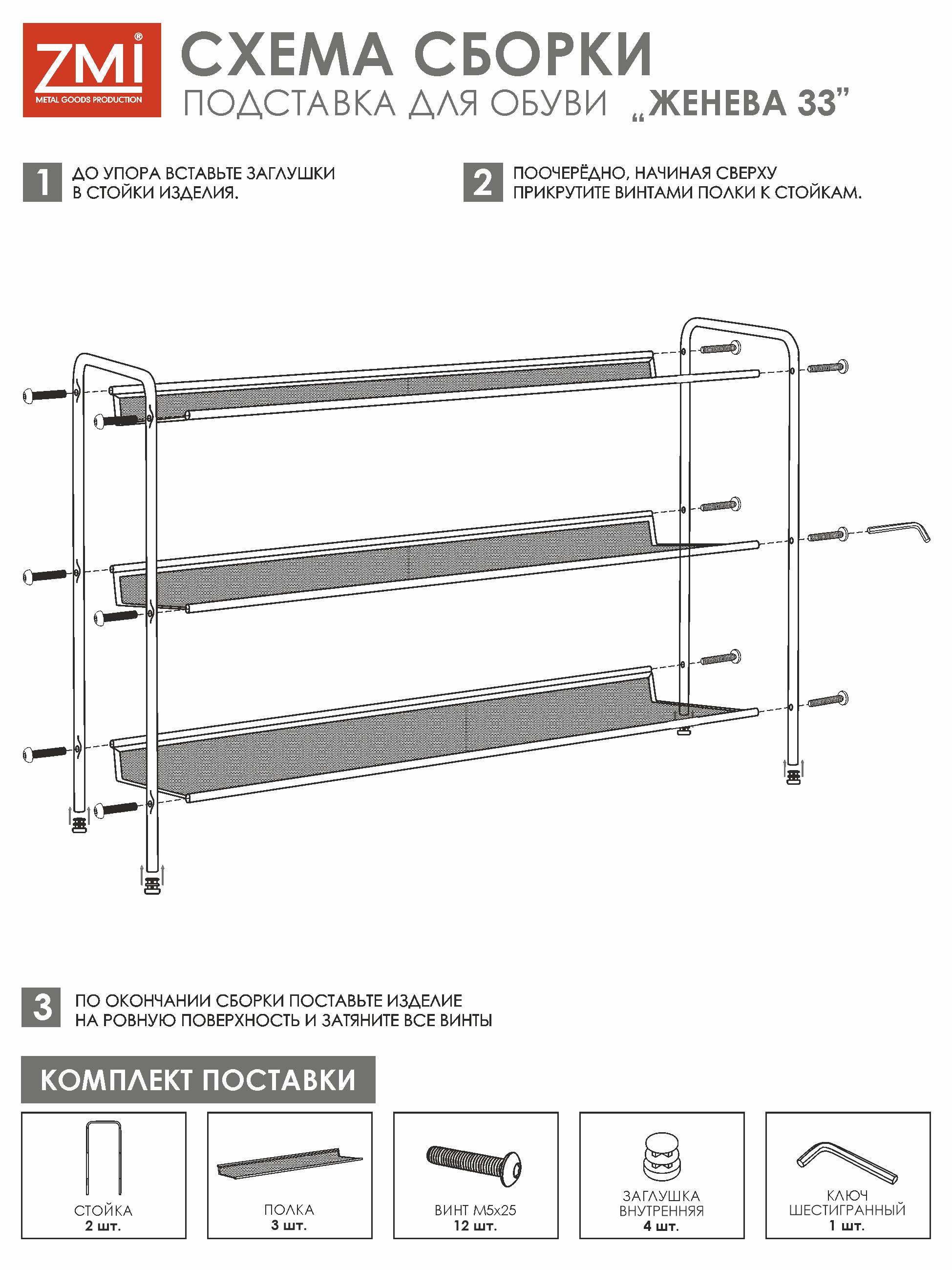 Стильная обувница «Женева 33» от российского производителя «ЗМИ» создана для компактного хранения обуви в доме или офисе.Долговечная, благодаря каркасу и полкам из стали. Три полки вместят до 12 пар обуви, а продуманные расстояния между ними позволят разместить как летнюю, так и зимнюю обувь. Благодаря наклону полок и бортикам ваши стены будут чистые. Каждая полка выдерживает нагрузку до 8 кг. Собирается легко, благодаря пошаговой инструкции. Все инструменты для сборки уже в комплекте.
