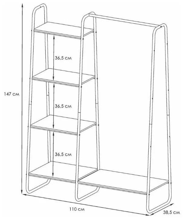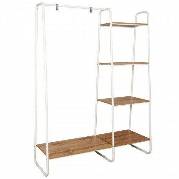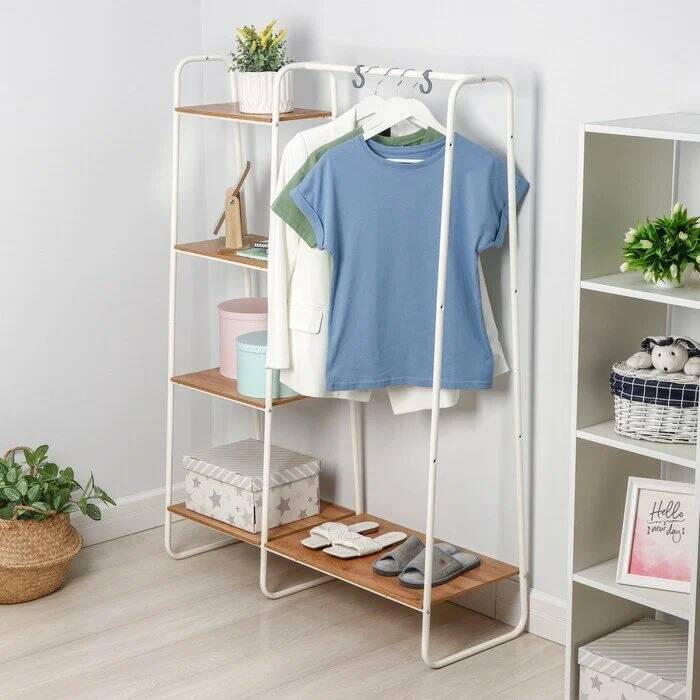 Полки стеллажа сделаны из ЛДСП. На перекладине можно разместить как плечики, так и подвесить цветы.