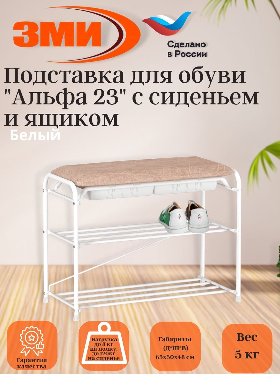 Подставка для обуви "Альфа 23" с сиденьем и ящиком (Белый) (3-х полочная,60см)