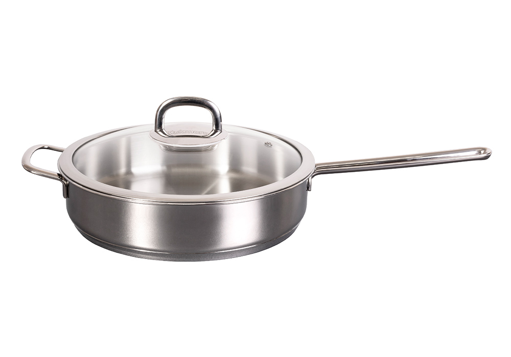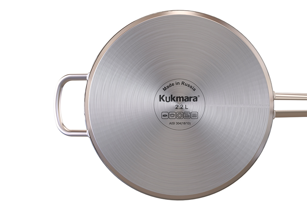 Посуда имеет плоское, утолщенное дно, состоящее из 3-х слоев металла: индукционного, термоаккумулирующего и проводящего, которое равномерно распределяет тепло и препятствует подгоранию пищи.
