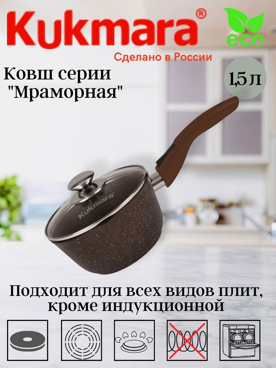 Мраморное, сверхпрочное, антипригарное покрытие с твердыми частицами натурального мрамора нового поколения на водной основе разработано специально для интенсивного использования на каждый день. Допускает использование только деревянных и силиконовых предметов. Покрытие абсолютно безопасно для здоровья, без PFOA. Покрытие не требует особенного ухода, легко моется как вручную, так и в посудомоечной машине.Ковш Kukmara с антипригарным покрытием имеет проточенное дно, которое обеспечивает максимальное прилегание дна посуды к плите для более быстрого и равномерного нагрева.