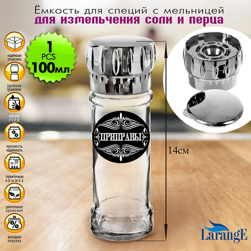 Емкость для специй с мельницей 75 мл от бренда "LarangE" — это идеальное сочетание эстетичности и практичности. Такое изделие станет украшением вашей кухни и не доставит хлопот в уходе.