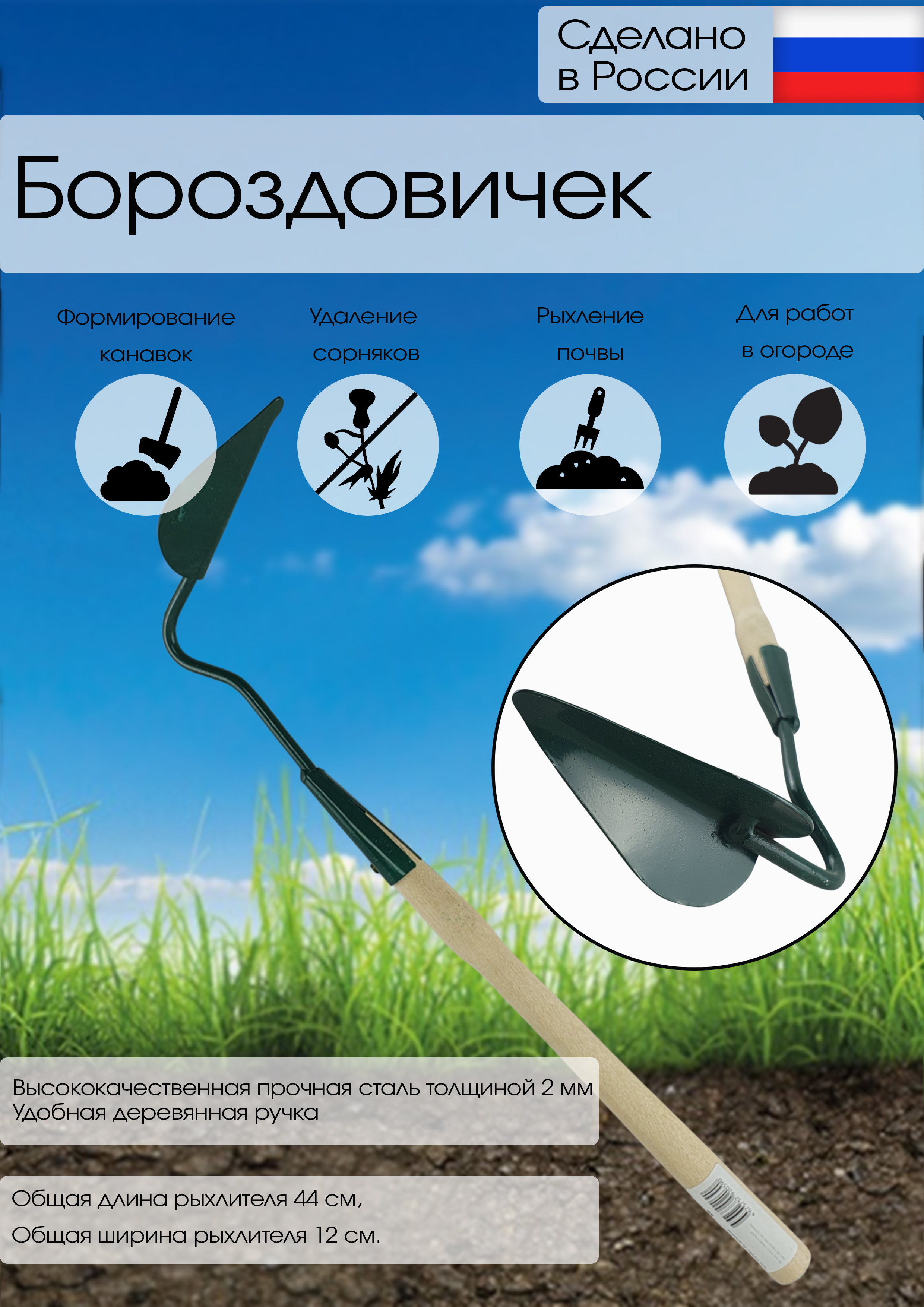 Бороздовичок предназначен для формирования борозд в почве при посеве семян. Инструмент изготовлен из среднеуглеродистой стали и покрыт порошковой эмалью