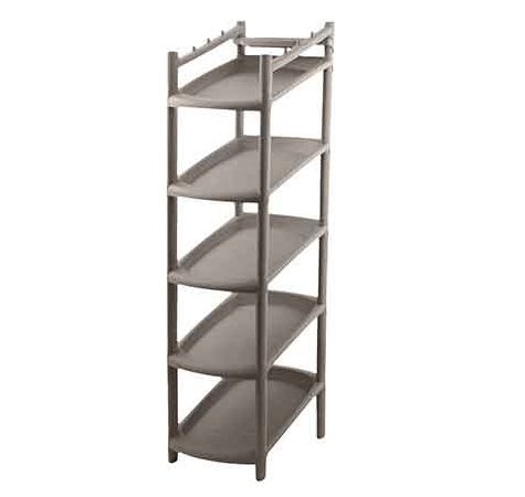 Узкая этажерка для обуви Rambai - это эффективное и недорогое решение для организации хранения обуви. Пять полок позволят разместить 5-10 пар обуви, в зависимости от размера, а компактный размер подойдет даже для небольших прихожих. Отличительная особенность этажерки - она узкая, всего 25 см в ширину и не займет много места. Габариты этажерки в собранном виде 41,5х25,5х105 см, она собирается без инструментов за несколько минут, достаточно соединить стойки и полки, вставить ножки и заглушки. На верхней полке этажерки предусмотрены бортики с выступами для ключей, ложечки для обуви или зонтика, а по центру - небольшая полочка для ключей или губки для обуви. Производится из прочного долговечного полипропилена, не боящегося перепадов температур и влажности.