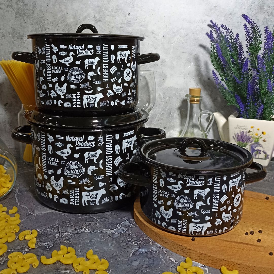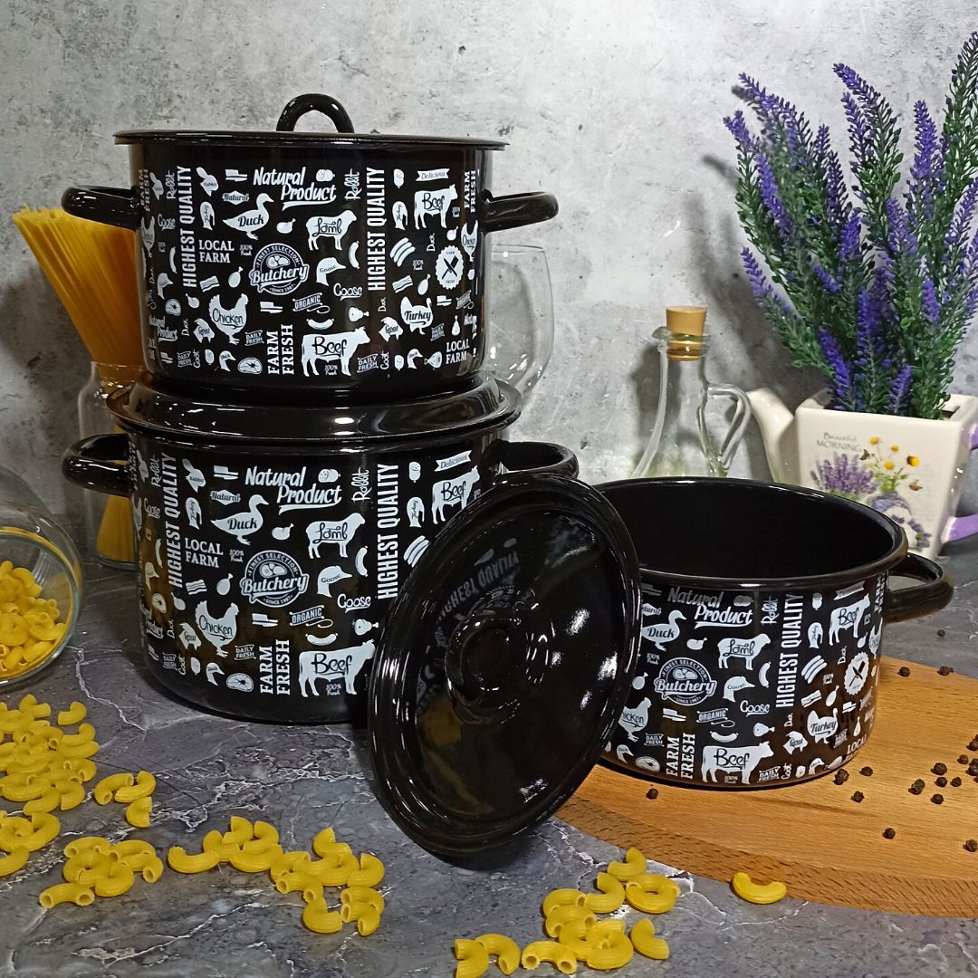 Набор кастрюль из эмалированной стали с объемами 1,5л; 2,9л; 4,5л; с красочными дизайнами, отлично подойдут под любой декор кухни. Данный набор станет радостью для ваших глаз. Посуда Стальэмаль рассчитана на длительный срок эксплуатации. Она подходит для любых видов плит и посудомоечных машин. Прочный корпус из холоднокатаного стального проката гарантирует эффективную тепловую обработку пищи. Благодаря двойному слою эмалевого покрытия исключается проникновение в пищу оксидов металла. Покрытие инертно и устойчиво к пищевым кислотам, не вступает во взаимодействие с продуктами и не искажает их вкусовые качества.