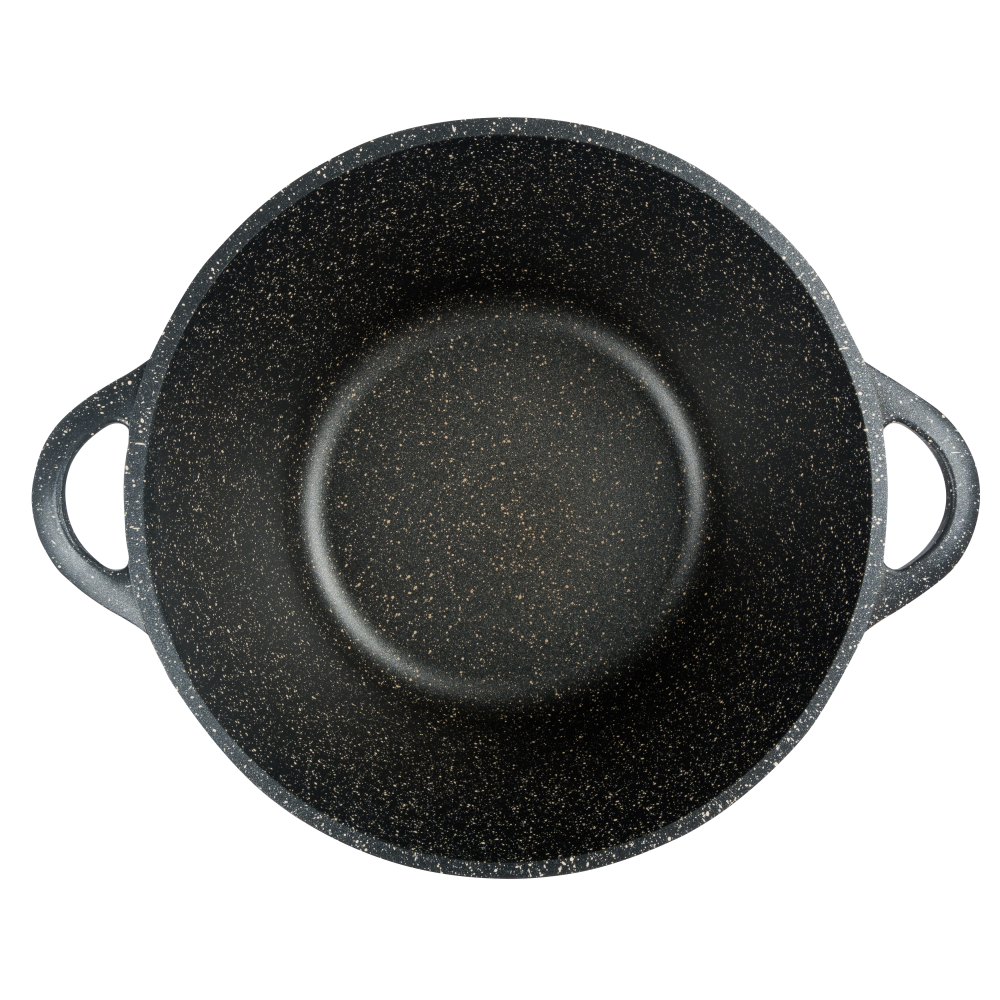 Сочетание классического черного цвета с белым крапом подчеркивает такие качества посуды, как высокопрочность и долговечность, подобно настоящей породе граниту.
