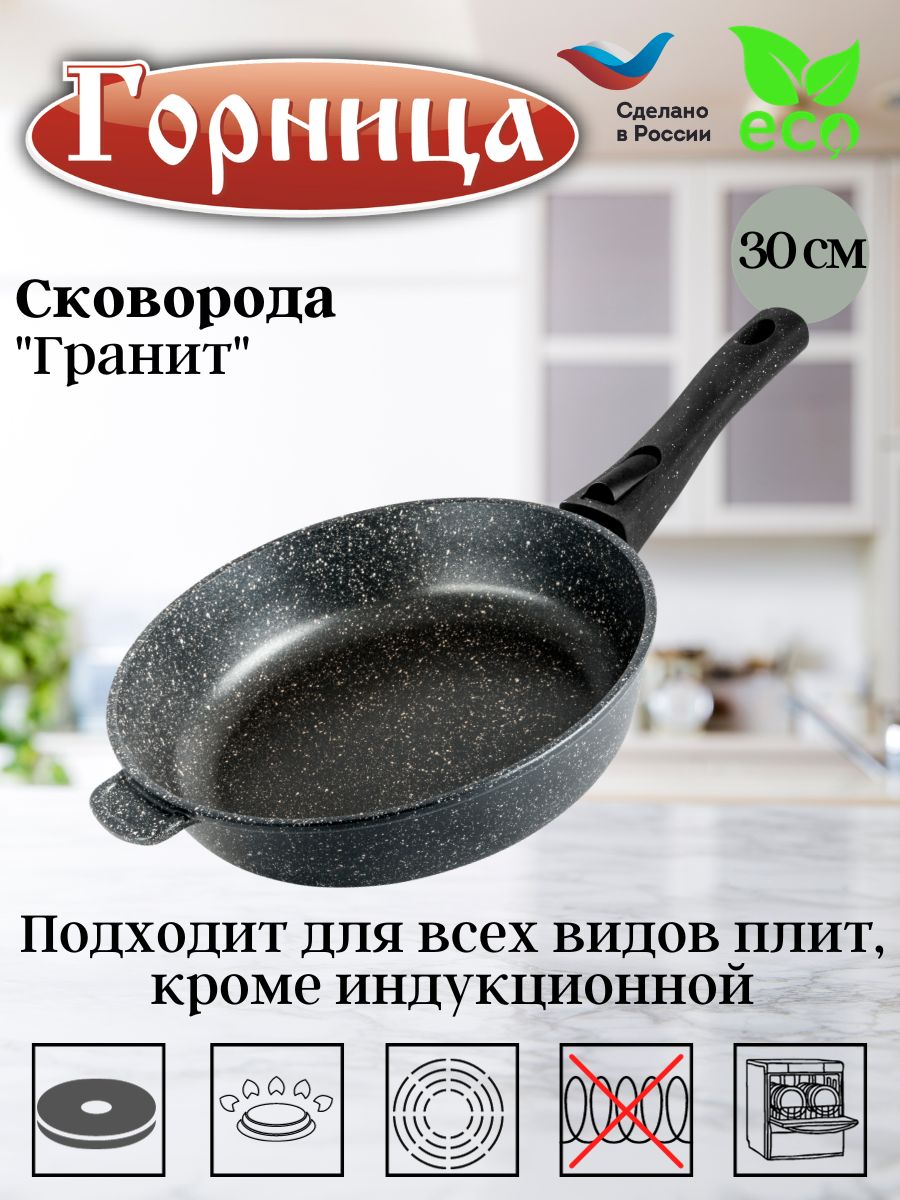 Литая алюминиевая сковорода с антипригарным покрытием – оригинальная посуда ТМ Горница, которая подходит для газовых, электрических, стеклокерамических плит. Необходима для приготовления различных продуктов: мяса, овощей, рыбы и т.д. «Гранит». Коллекция «мраморной посуды» с улучшенным четырёхслойным антипригарным покрытием. Дополнительный слой с мраморным эффектом увеличивает износостойкость и создаёт оттенок чёрного мрамора. Сковорода литая изготовлена из пищевого алюминия без канцерогенных веществ. Антипригарная сковорода имеет толстые стенки и утолщенное дно, что способствует равномерному распределению тепла и создает благоприятные условия для качественного процесса готовки. Антипригарное покрытие на водной основе не содержит вредных химических соединений. Посуда металлическая имеет гладкую поверхность, что облегчает процесс мытья. Сковорода со съёмной ручкой применяется в духовом шкафу. Ручка для сковороды из бакелита не нагревается и не выскальзывает из рук.