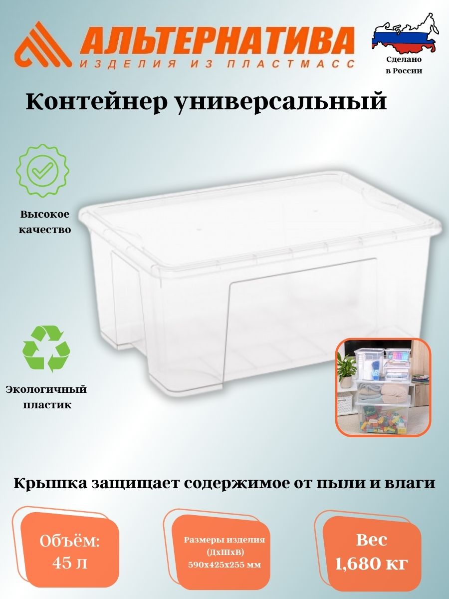 Универсальный контейнер из прочного и долговечного материала предназначен для хранения различных предметов, инструментов и других вещей. Контейнер имеет объём 45 литров, что позволяет хранить достаточно большое количество предметов.