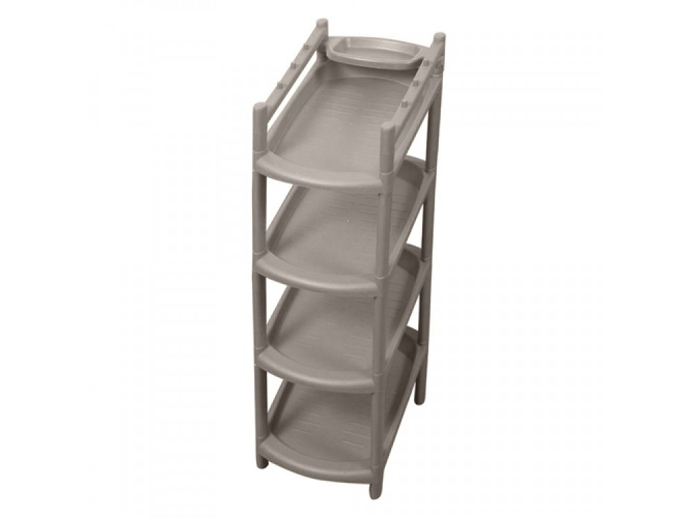 Узкая этажерка для обуви Rambai - это эффективное и недорогое решение для организации хранения обуви. Четыре полки позволят разместить 4-8 пар обуви, в зависимости от размера, а компактный размер подойдет даже для небольших прихожих. Отличительная особенность этажерки - она узкая, всего 25 см в ширину и не займет много места. Габариты этажерки в собранном виде 41,5х25,5х81 см, она собирается без инструментов за несколько минут, достаточно соединить стойки и полки, вставить ножки и заглушки. На верхней полке этажерки предусмотрены бортики с выступами для ключей, ложечки для обуви или зонтика, а по центру - небольшая полочка для ключей или губки для обуви. Производится из прочного долговечного полипропилена, не боящегося перепадов температур и влажности.