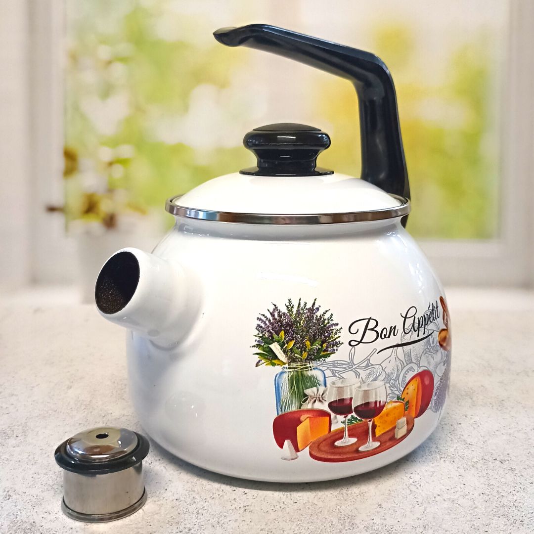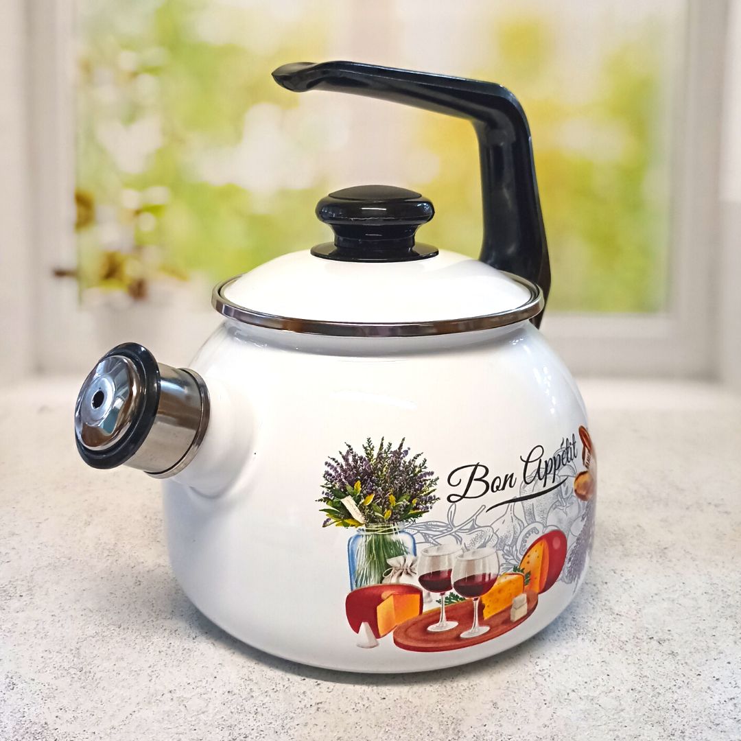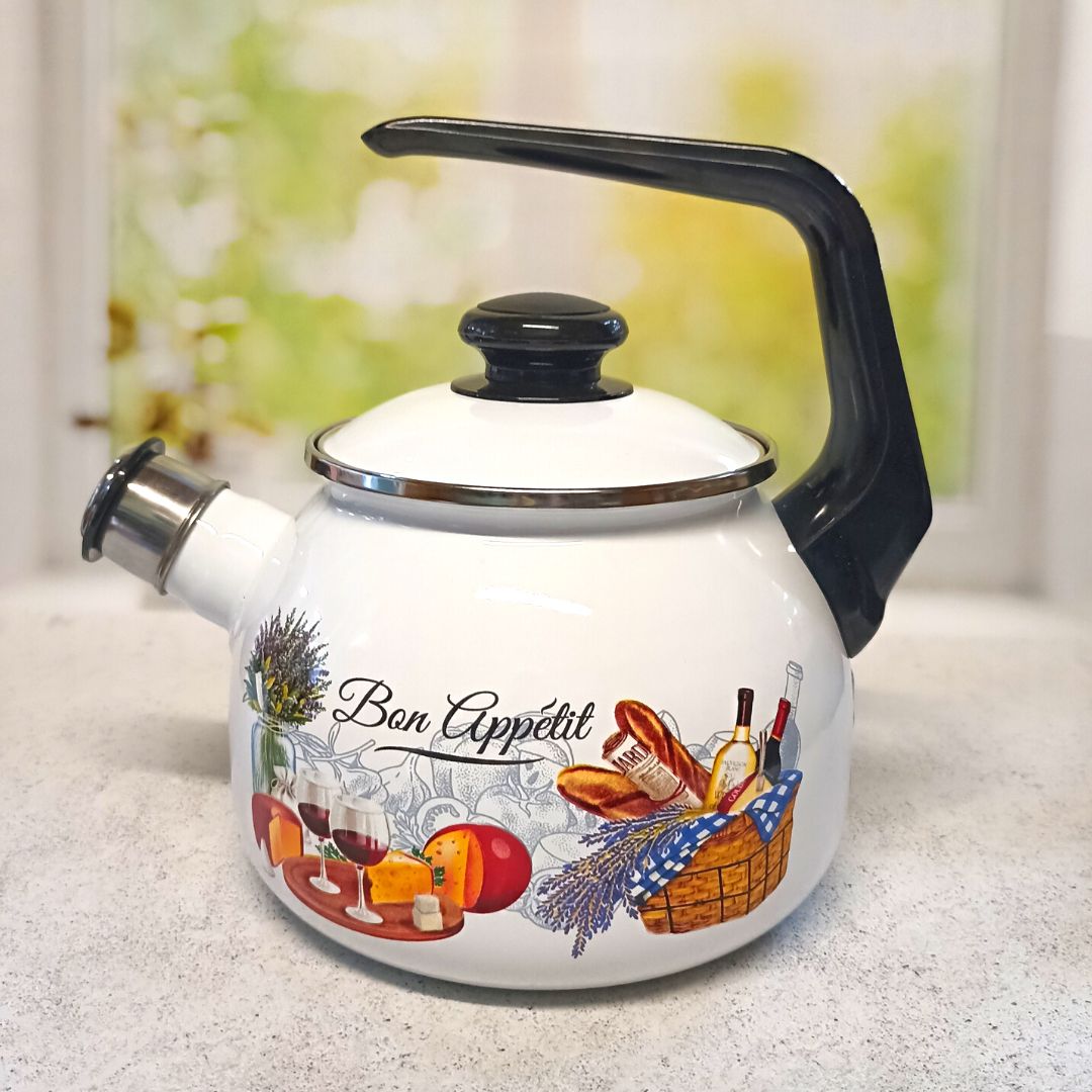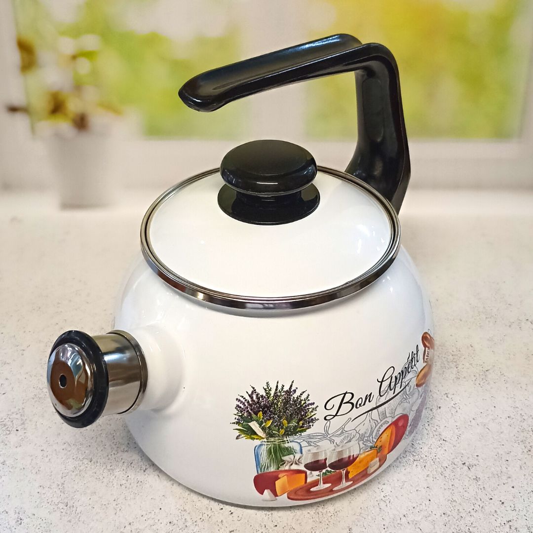 Чайник для плиты со свистком 2,5 л. Внешнее трехслойное эмалевое покрытие не вступает во взаимодействие с пищевыми продуктами, защищает сталь от коррозии, придает посуде гладкую стекловидную поверхность и надежно защищает от кислот и щелочей. Свисток съемный из нержавеющей стали. Крышка плотно прилегает к краю. Может быть использован на всех типах кухонных плит: электрических, газовых, керамических, индукционных. Подходит для мытья в посудомоечной машине