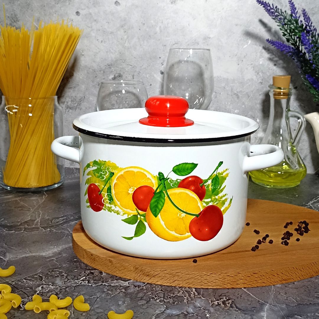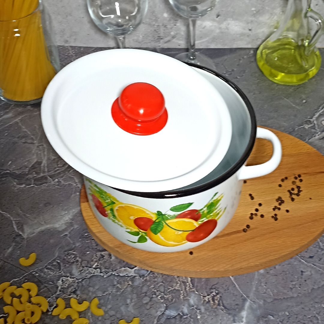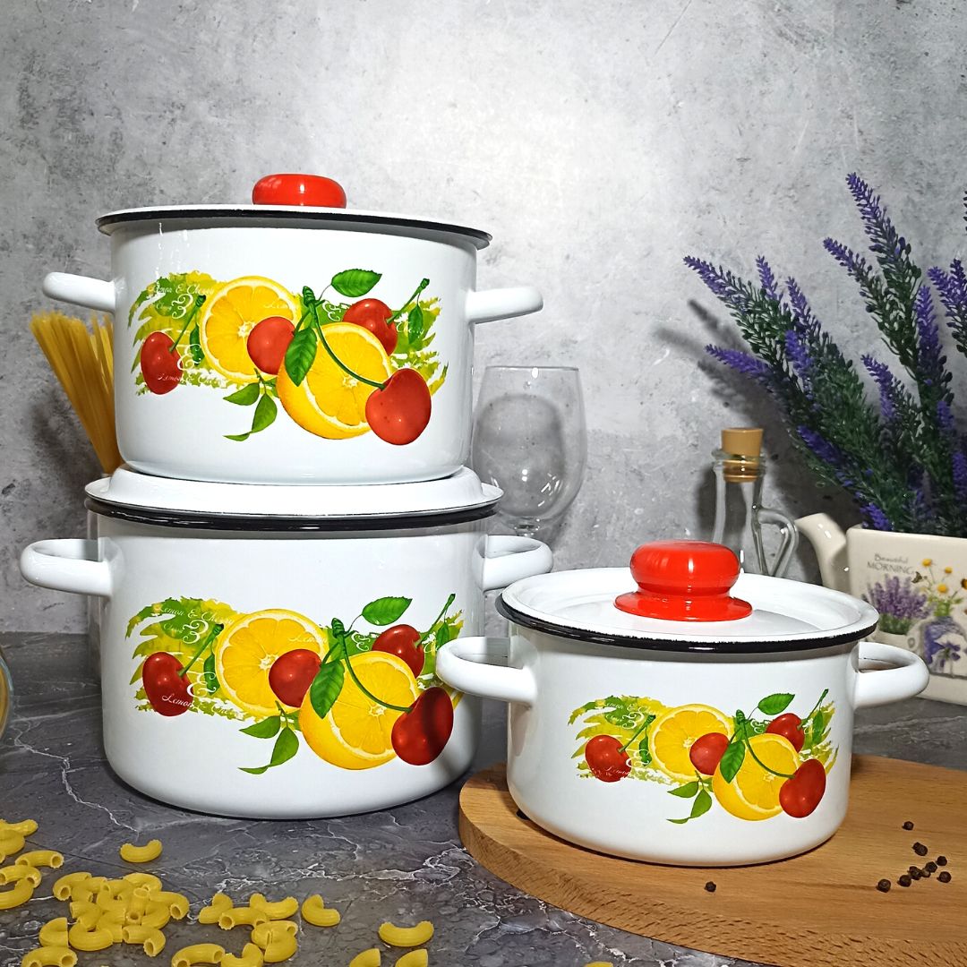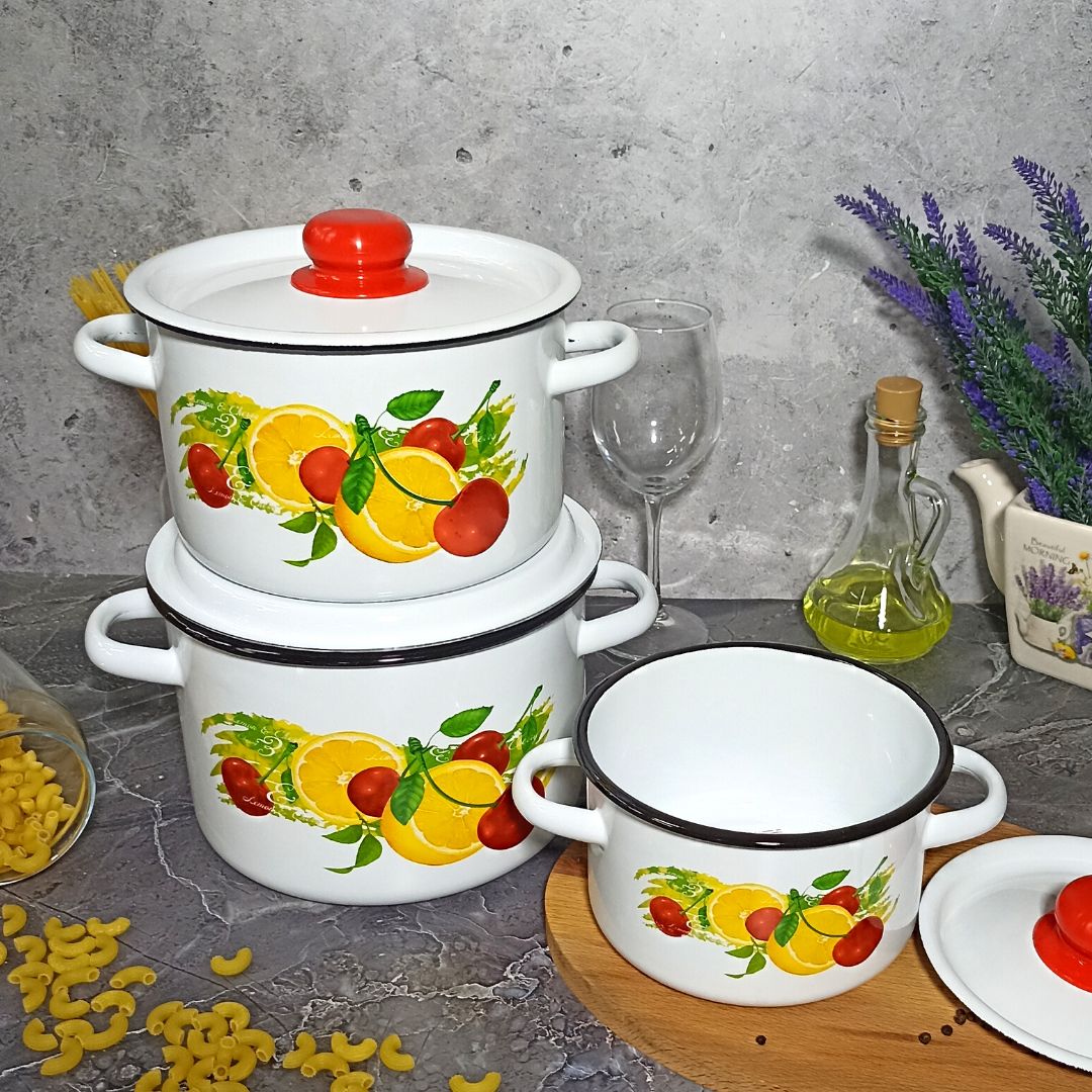 Набор их трёх цилиндрических кастрюль с высоким корпусом изготовлен по ГОСТ 24788 из высококачественного стального проката, покрытого двумя слоями жаропрочной эмали. Эмалевое покрытие на основе силикатных фритт, являясь стекольной массой, не вступает во взаимодействие с продуктами, не искажает их вкусовые качества, не окисляется, при нагревании не выделяет опасные для здоровья человека соединения. Многослойное эмалевое покрытие практично, долговечно и устойчиво к появлению царапин и сколов. Эмалированная посуда подходит для кухонных плит любого типа, в том числе индукционных, а так же для использования в посудомоечной машине. На дне и под бортом изделий могут присутствовать следы от обжигового инструмента, которые не относятся к браковочным признакам и не влияют на эксплуатационные свойства и безопасность посуды.