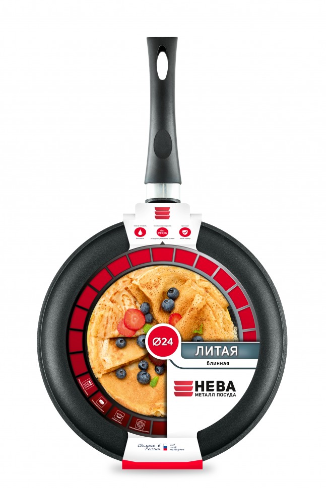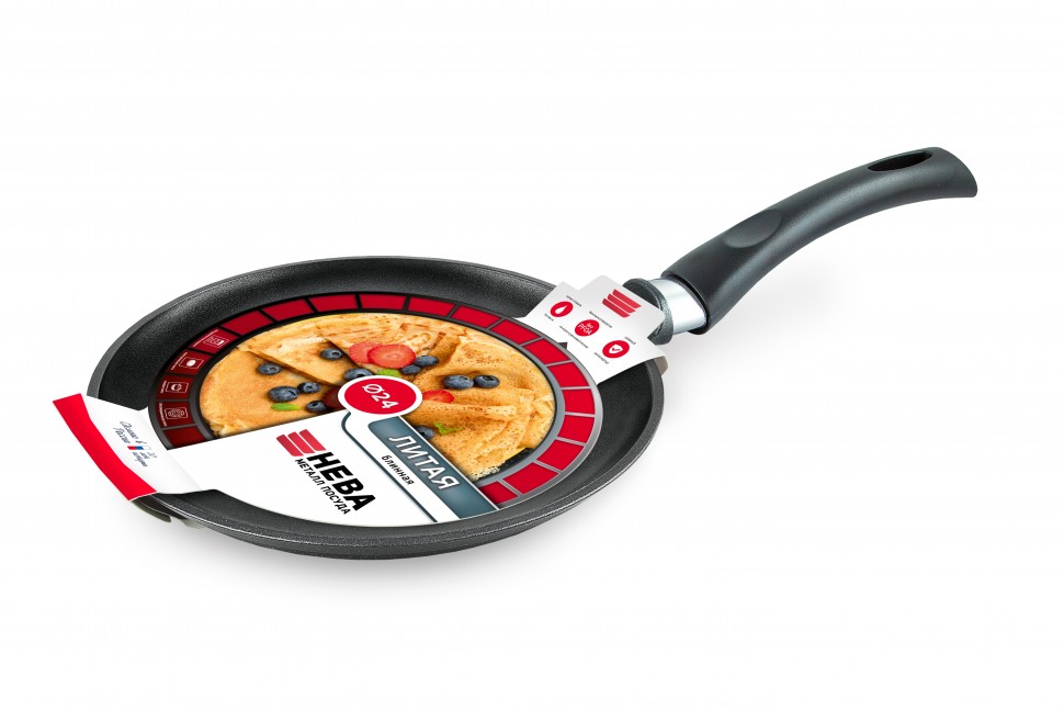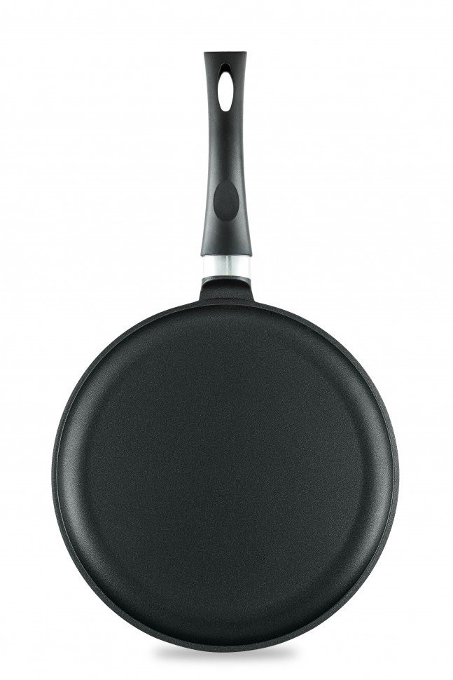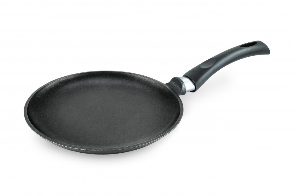 Блинная сковорода имеет низкий борт и удобную ручку, благодаря чему легко переворачивать и снимать блины. Утолщенное дно обеспечивает особые термоаккумулирующие свойства. Толщина дна 4мм, толщина бортов 2,7мм. высота бортов 18мм.