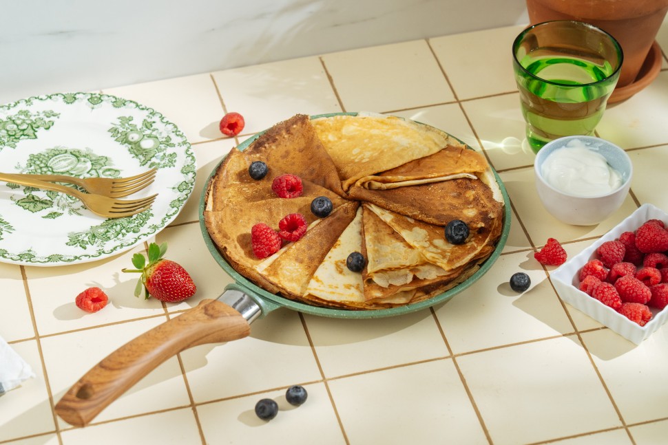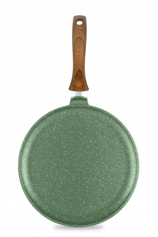 Блинная сковорода имеет низкий борт и удобную ручку, благодаря чему легко переворачивать и снимать блины. Утолщенное дно обеспечивает особые термоаккумулирующие свойства: блин равномерно пропекается по всей толщине и красиво румянится с обеих сторон.Корпус сковороды выполнен из высококачественного пищевого сплава алюминия, такой корпус равномерно нагревается и не деформируется со временем.Антипригарное покрытие на водно-кремниевой основе усилено минеральными частицами, отличается высокой износостойкостью. Благодаря антипригарному покрытию блины всегда легко соскальзывают со сковороды и не пригорают, даже при выпекании без использования масла.
