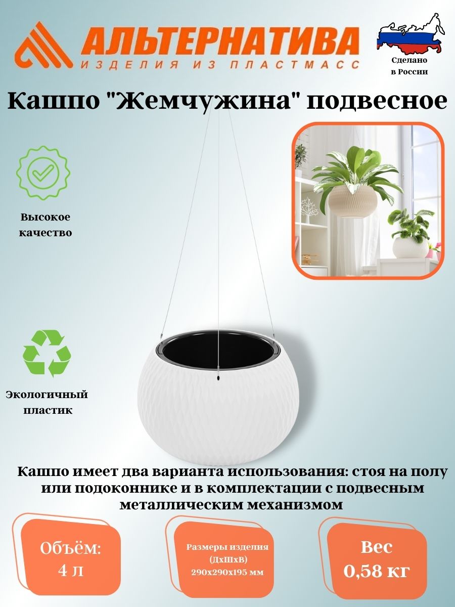 Кашпо «Жемчужина» предназначено для выращивания комнатных и уличных растений. Оно имеет два варианта использования: стоя на полу или подоконнике и в комплектации с подвесным металлическим механизмом, что позволит подвешивать кашпо как дома, так и на садовых участках, расширяя варианты выбора растений от прямых до вьющихся. Кашпо состоит из двух частей. Внутренняя вставка имеет отверстия и предотвращает перелив растений и загнивание корней. Внешняя часть защищает кашпо от протекания, а многогранная поверхность придает визуальную легкость и особенную эстетику изделию. Благодаря необычной сферической форме оно станет украшением любого интерьера.