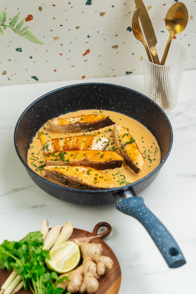 Премиальное антипригарное покрытие отличается высокой износостойкостью, устойчиво к царапинам и другим повреждениям, позволяет готовить любимые блюда без добавления масла, сохраняя сочность и полезные свойства продуктов.