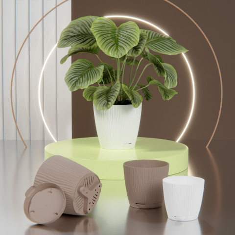 Горшок состоит из кашпо и поддона, которые надежно крепятся между собой. Горшок оснащен дренажной решеткой и специальным носиком, с помощью которого производится прикорневой полив. Такая система полива создает вентиляцию в корневой системе растения, а также позволяет выходить лишней влаге из почвы. Рифлёный рисунок имитирует рельефную текстуру традиционной керамики ручной работы. «Волнистая» поверхность сохраняет свою форму как с внешней, так и с внутренней стороны горшка. Горшок «Флис» не только привлекает своим стильным и современным дизайном, но также поддерживает оптимальный уровень влаги в корне растения. Благодаря этой системе, вы можете заботиться о своем растении и наслаждаться его красотой без лишних хлопот.