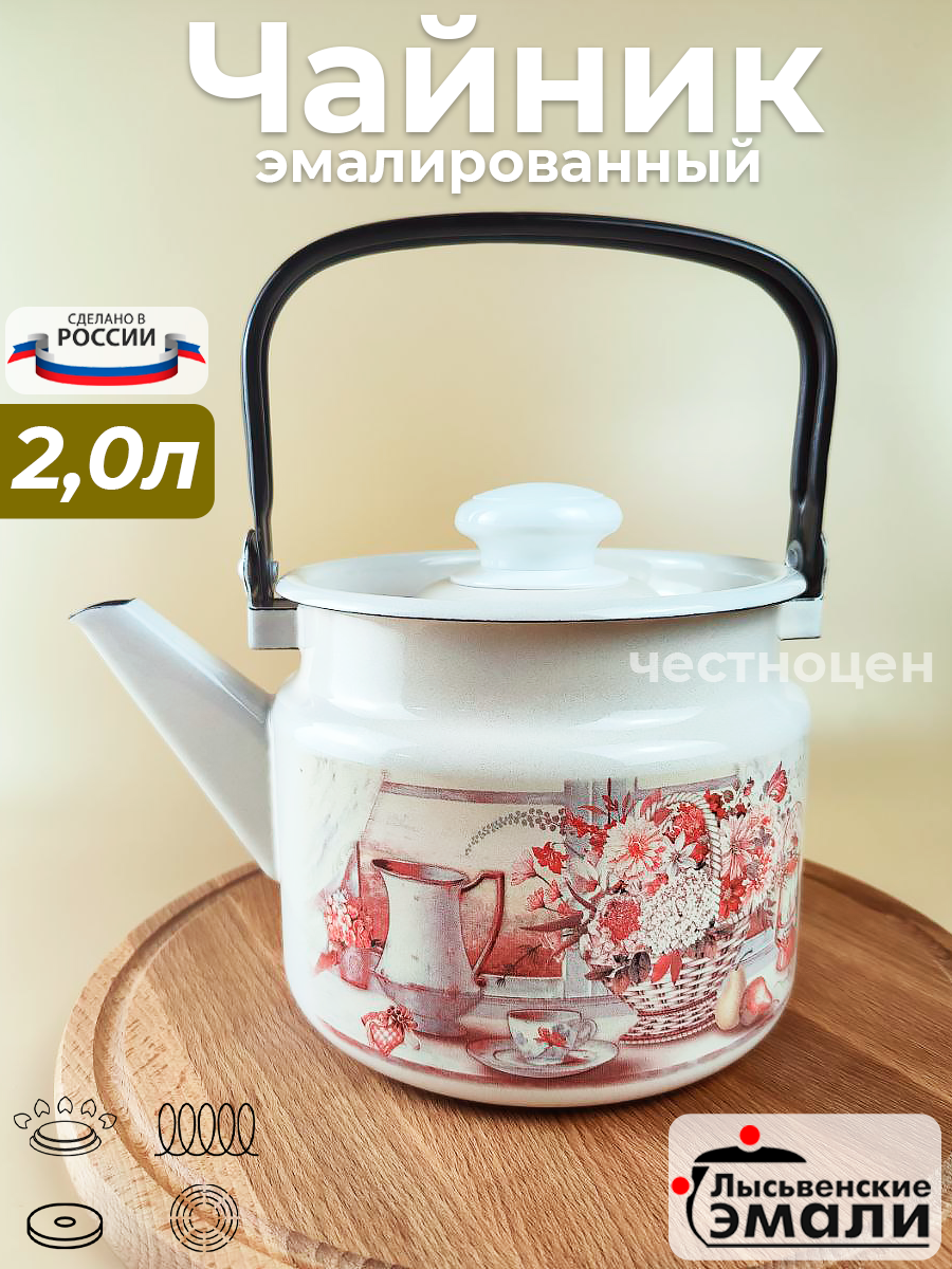 Чайник с подвижной ручкой 2 л Летний этюд выполнен из качественной стали, которая покрыта двумя слоями жаропрочной эмали. Такое покрытие защищает сталь от коррозии, придает посуде гладкую стекловидную поверхность и надежно защищает от кислот и щелочей.