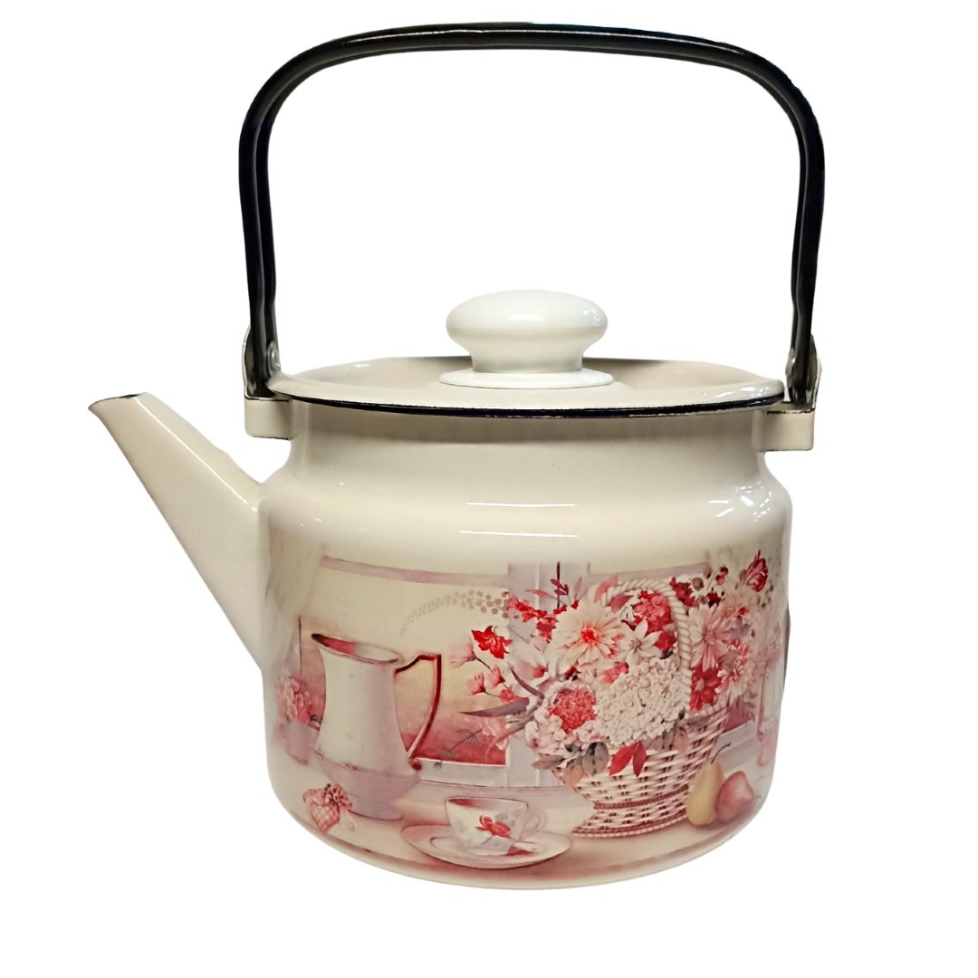 Чайник с подвижной ручкой 2 л Летний этюд выполнен из качественной стали, которая покрыта двумя слоями жаропрочной эмали. Такое покрытие защищает сталь от коррозии, придает посуде гладкую стекловидную поверхность и надежно защищает от кислот и щелочей.