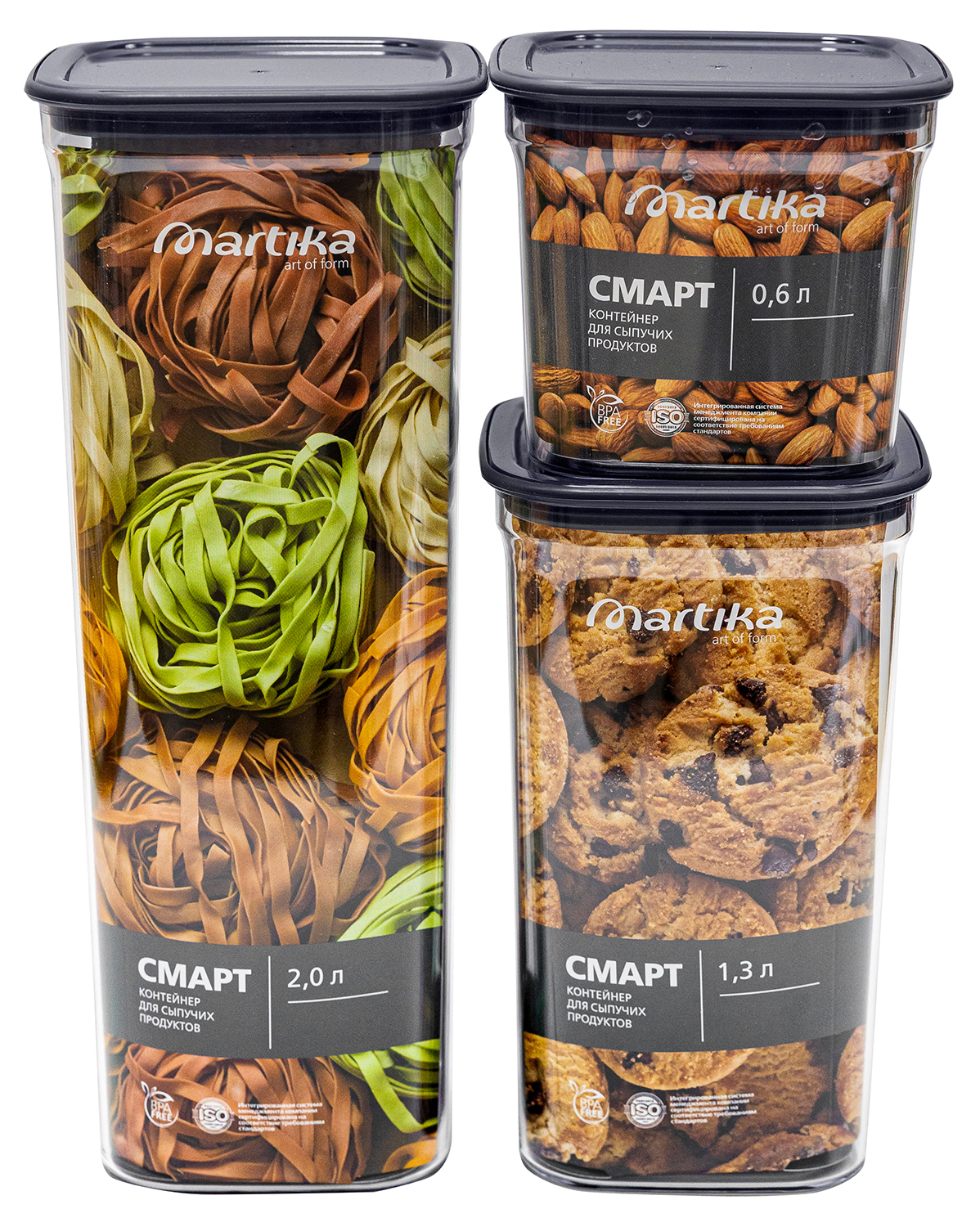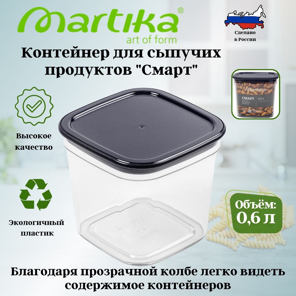 Линейка контейнеров для сыпучих «СМАРТ» - это универсальный набор для вашей кухни. Контейнер 0.6 л – это отличное решение для хранения чая, орехов, конфет, печенья и прочих сладостей. Благодаря прозрачной колбе легко видеть содержимое контейнеров. Плотная посадка крышки исключает случайное просыпание, не пропускает запахи и сохраняет свежесть продуктов. Продуманное штабелирование контейнеров «Смарт» позволяет компактно и эффективно организовать пространство для хранения на кухонных полках или в ящиках.
