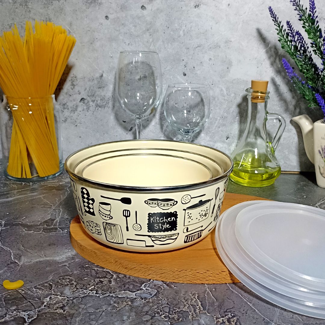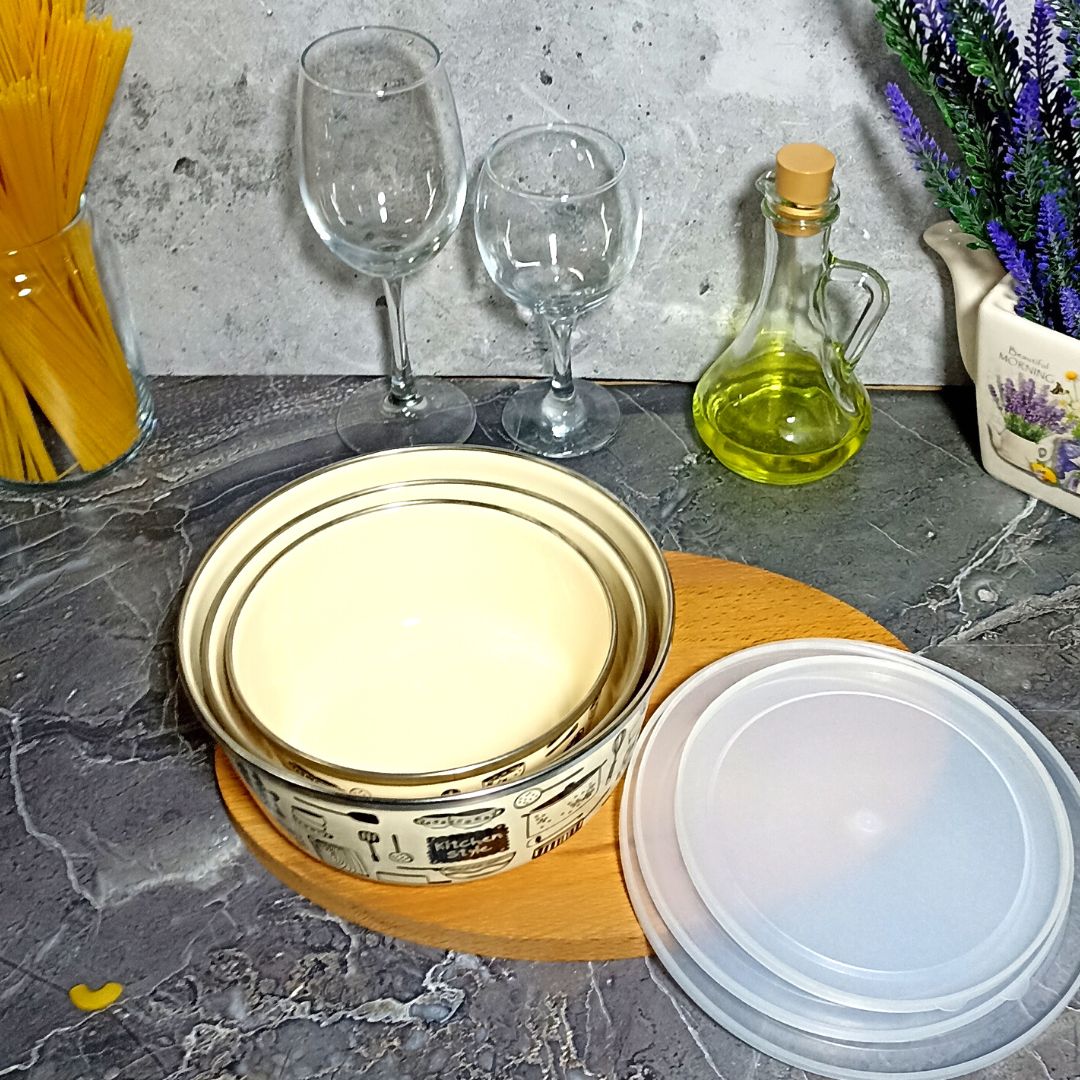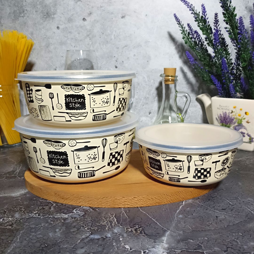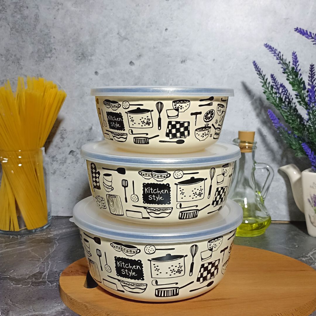 Набор мисок с пластиковыми крышками.Эмалевое покрытие на основе силикатных фритт, являясь стекольной массой, не вступает во взаимодействие с продуктами, не искажает их вкусовые качества, не окисляется, не выделяет опасные для здоровья человека соединения. Многослойное эмалевое покрытие практично, долговечно и устойчиво к появлению царапин и сколов.