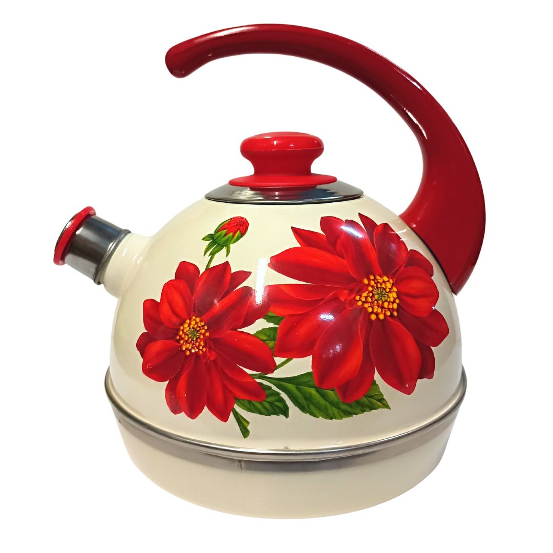 Чайник эмалированный со свистком. Внешнее трехслойное эмалевое покрытие не вступает во взаимодействие с пищевыми продуктами, защищает сталь от коррозии, придает посуде гладкую стекловидную поверхность и надежно защищает от кислот и щелочей. Фиксированная консольная бакелитовая ручка. Свисток съемный из нержавеющей стали. Крышка плотно прилегает к краю. Может быть использован на всех типах кухонных плит: электрических, газовых, керамических, индукционных. Подходит для мытья в посудомоечной машине.