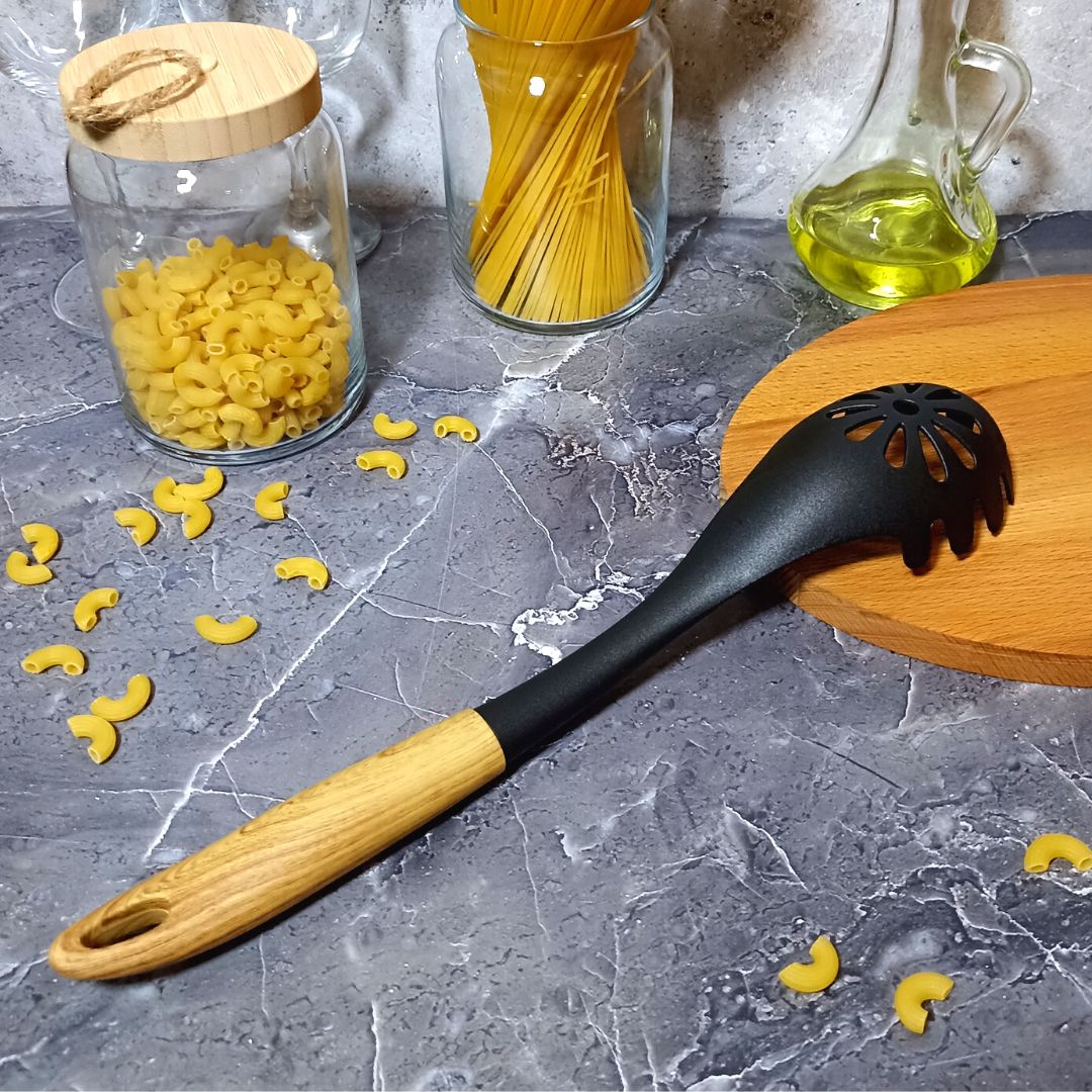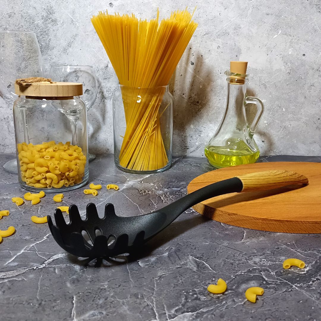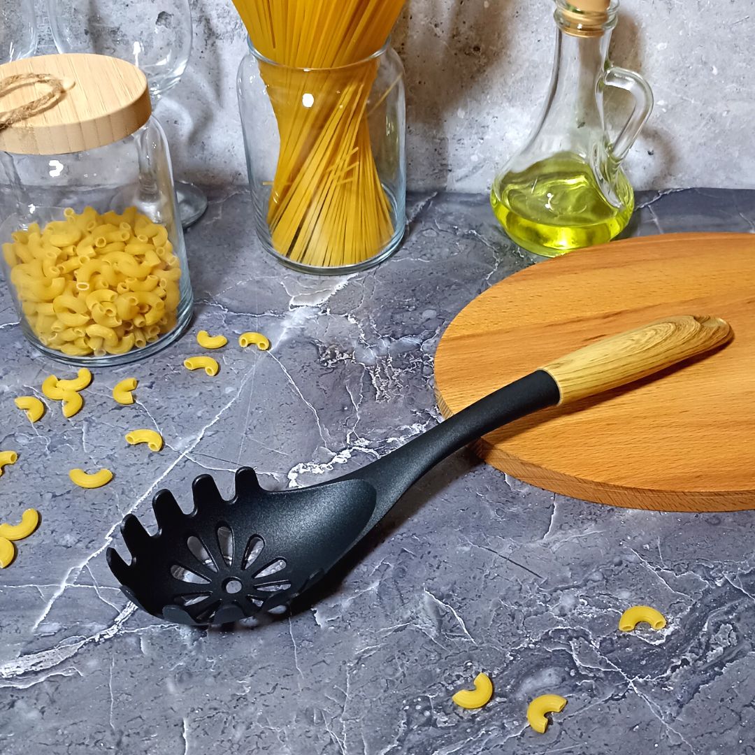 Ложка для спагетти из нейлона Forest– незаменимый аксессуар на вашей кухне! Этот прочный и функциональный инструмент станет вашим надежным помощником в приготовлении различных блюд, особенно спагетти. Ложка кулинарная выполнена из высококачественного нейлона, что делает ее долговечной и устойчивой к высоким температурам.Благодаря продуманной конструкции, ложка для спагетти Forest позволяет легко перемешивать и подавать пасту, не повреждая поверхность кастрюль и сковородок. Эргономичная ручка обеспечивает удобный хват, минимизируя нагрузку на руку даже при длительном использовании. Отверстия на ложке позволяют стекать лишней воде, что предотвращает слипание макаронных изделий.Ложка для спагетти достаточно легкая, что делает ее удобной в обращении. Она легко моется как вручную, так и в посудомоечной машине, не впитывает запахи и не деформируется. Этот аксессуар станет отличным дополнением к вашему кухонному арсеналу.