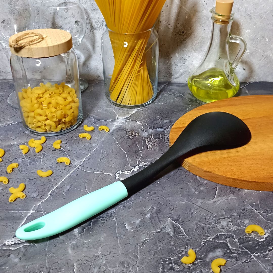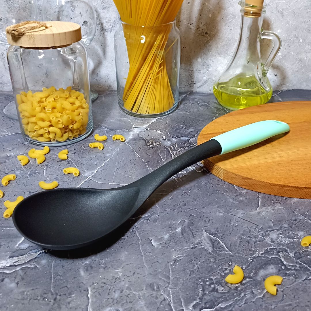 Поварская ложка из жаропрочного нейлона предназначена для перемешивания блюд в процессе приготовления, а также при помощи нее удобно накладывать готовые горячие блюда и салаты. Идеально подходит для посуды с антипригарным покрытием, не царапает поверхности. Устойчива к деформации в широком диапазоне температур от -40 до +210 градусов Цельсия. Эргономичная ручка не нагревается и не выскальзывает из рук. Ложка выполнена из безопасных материалов, не выделяет вредных веществ. Изделие можно мыть в посудомоечной машине.