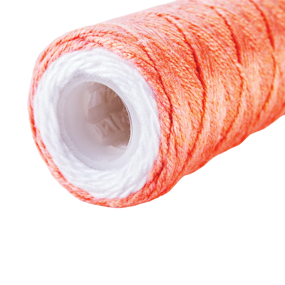 Внутренний белый слой — намотка специально обработанной полипропиленовой нити. Она задерживает мелкую взвесь, а также частицы нерастворенного железа. Благодаря переменной намотке тонкость фильтрации картриджа изменяется от 5 до 1 мкм. Подходит к любым проточным фильтрам стандарта SL10 и БАРЬЕР ПРОФИ.