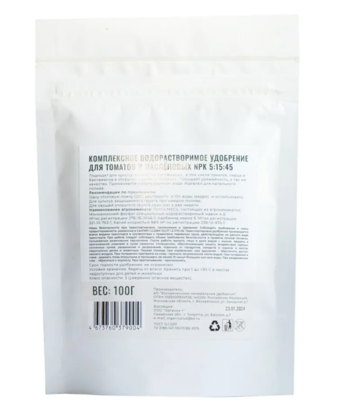Водорастворимое удобрение для томатов и паслёновых культур NPK 5:15:45 подходит для культур семейства пасленовых, в том числе и томатов, перца и баклажанов в открытом грунте и теплице. Повышает урожайность, а также качество. Применяется в растворенном виде. Идеален для капельного полива.