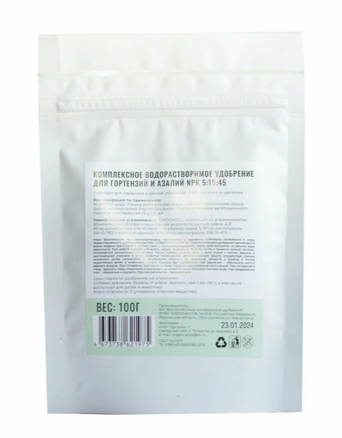 Водорастворимое удобрение для гортензий и азалий NPK 5:15:45 подходит для гортензий и азалий. Усиливает рост растения и цветение.