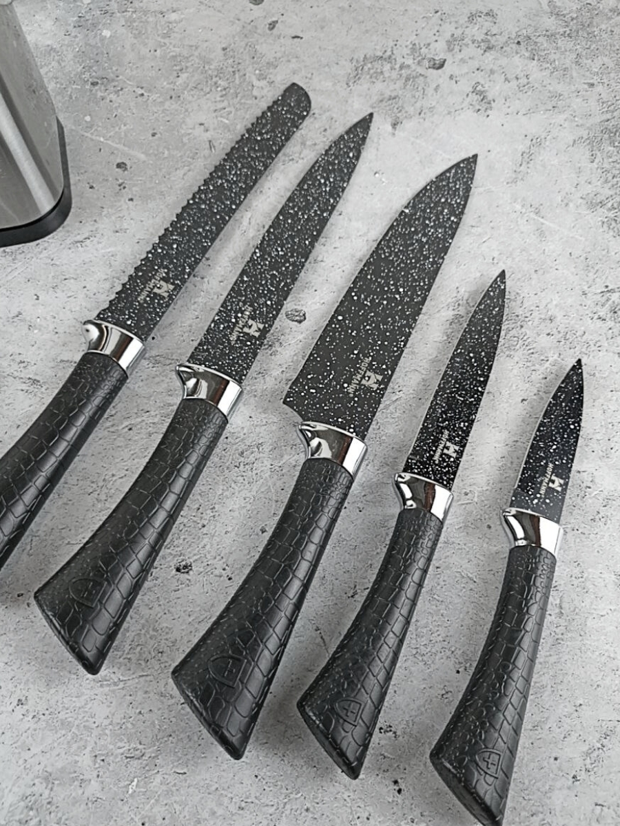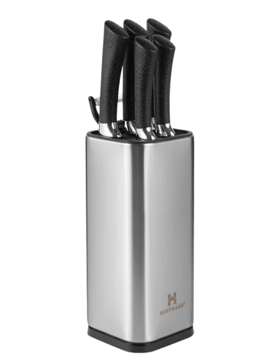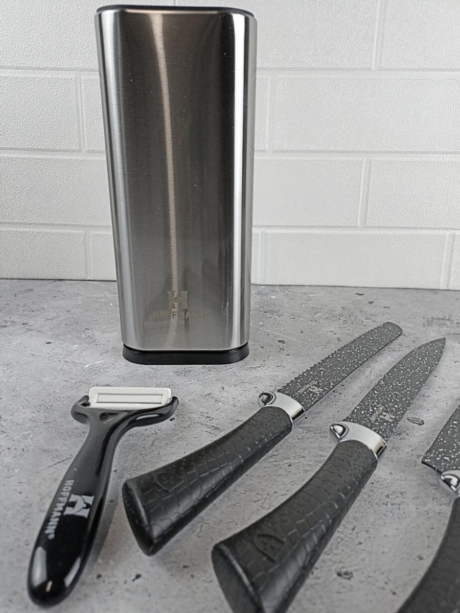 Набор: поварской нож 20 см, нож для хлеба 20 см, нож для нарезки 20 см, универсальный нож 12,5 см, нож для чистки овощей и фруктов 8,5 см, керамический пиллер, прямоугольная акриловая подставка.