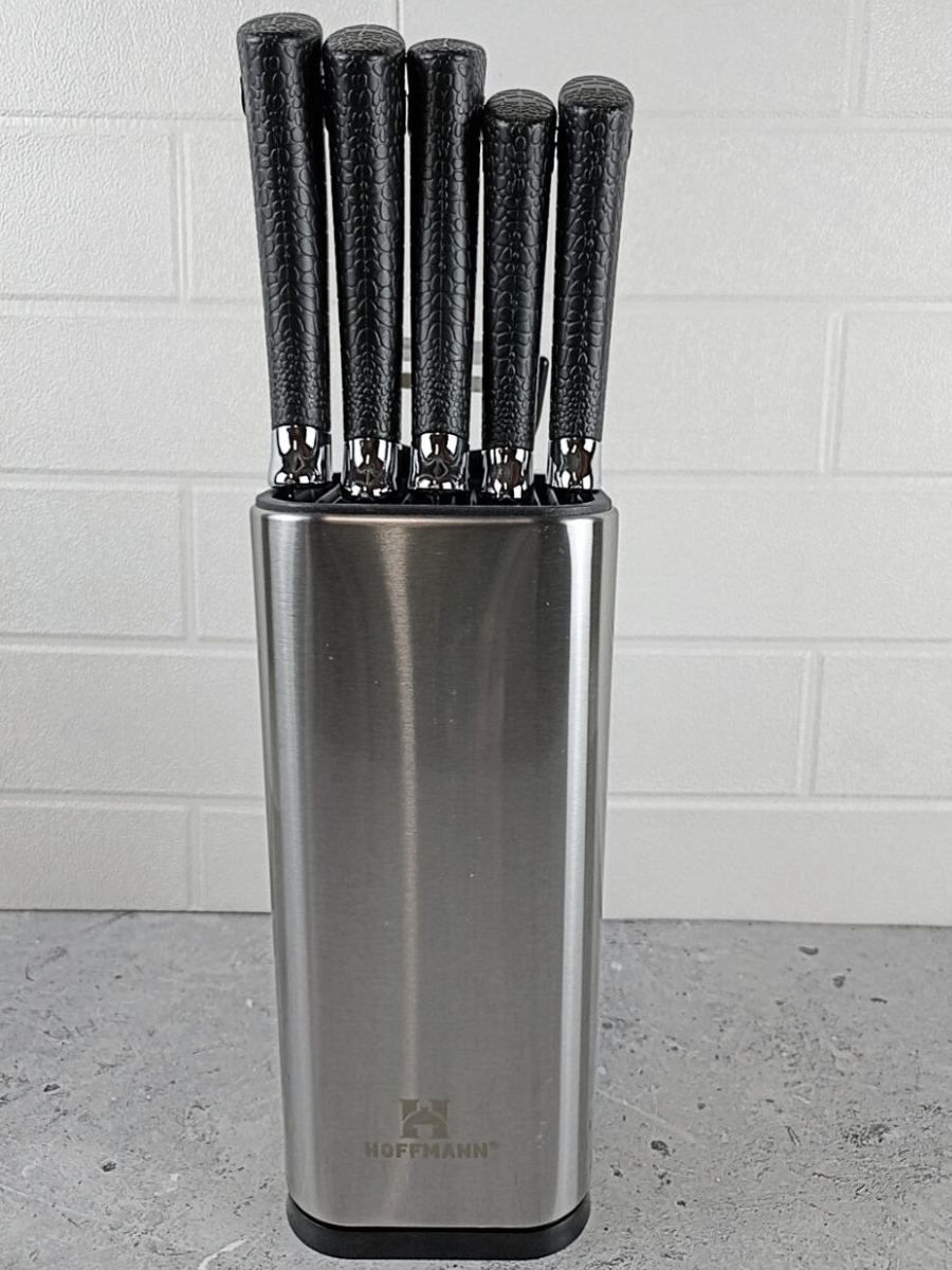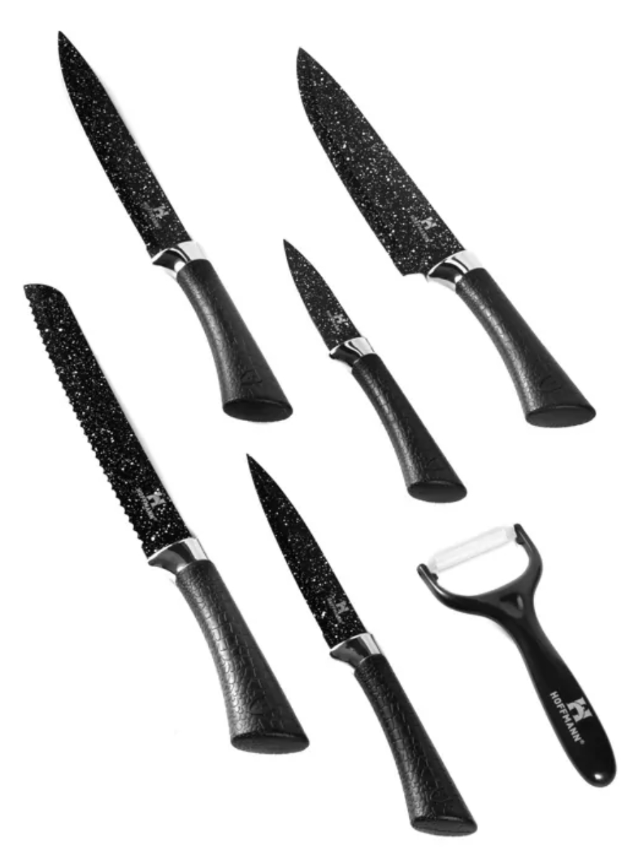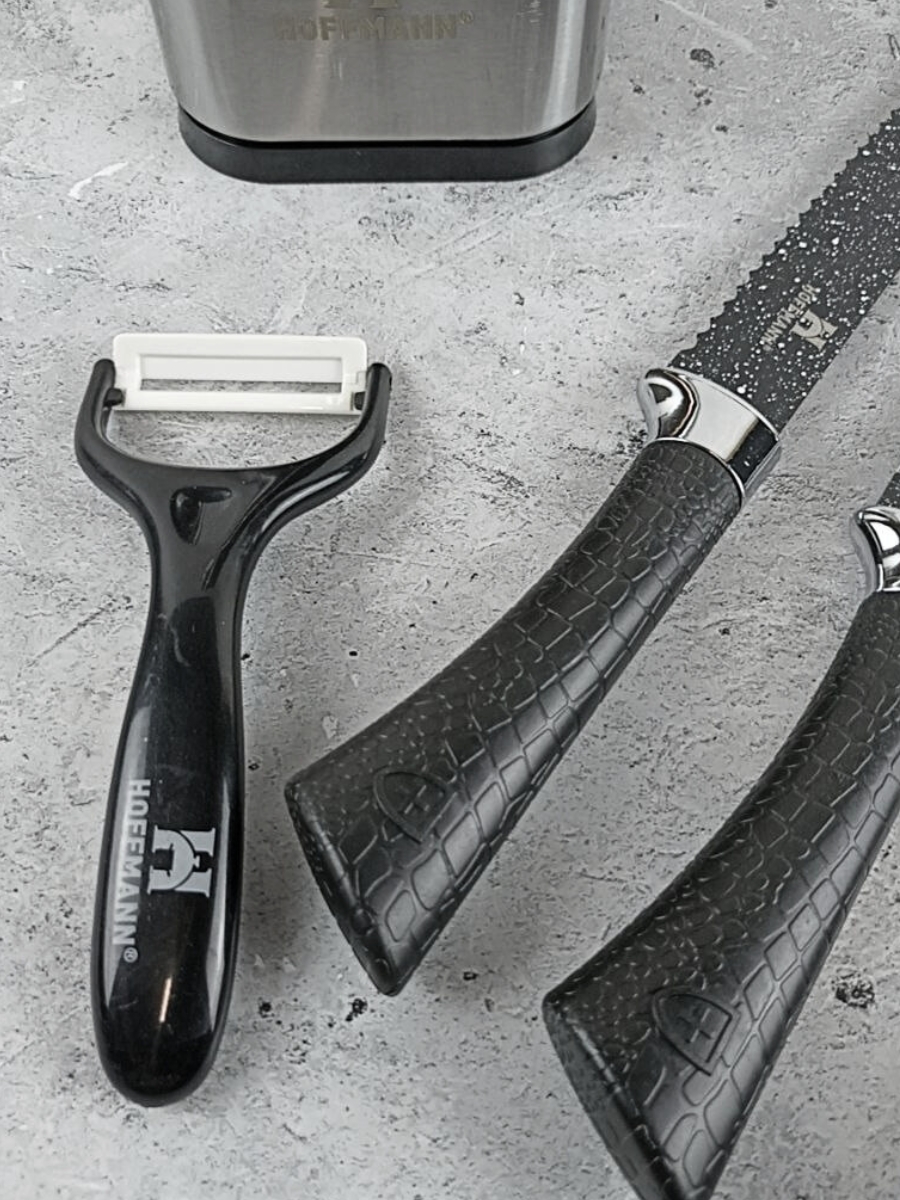 Набор: поварской нож 20 см, нож для хлеба 20 см, нож для нарезки 20 см, универсальный нож 12,5 см, нож для чистки овощей и фруктов 8,5 см, керамический пиллер, прямоугольная акриловая подставка.