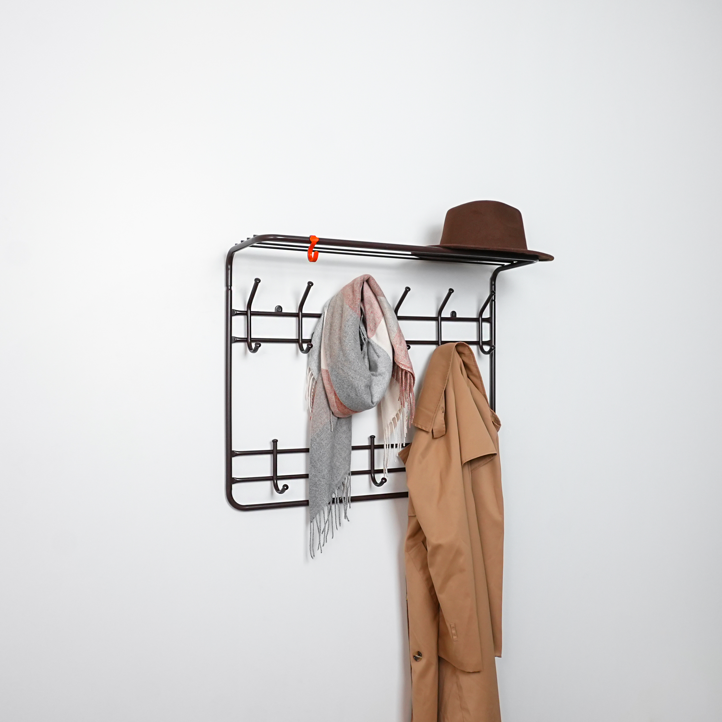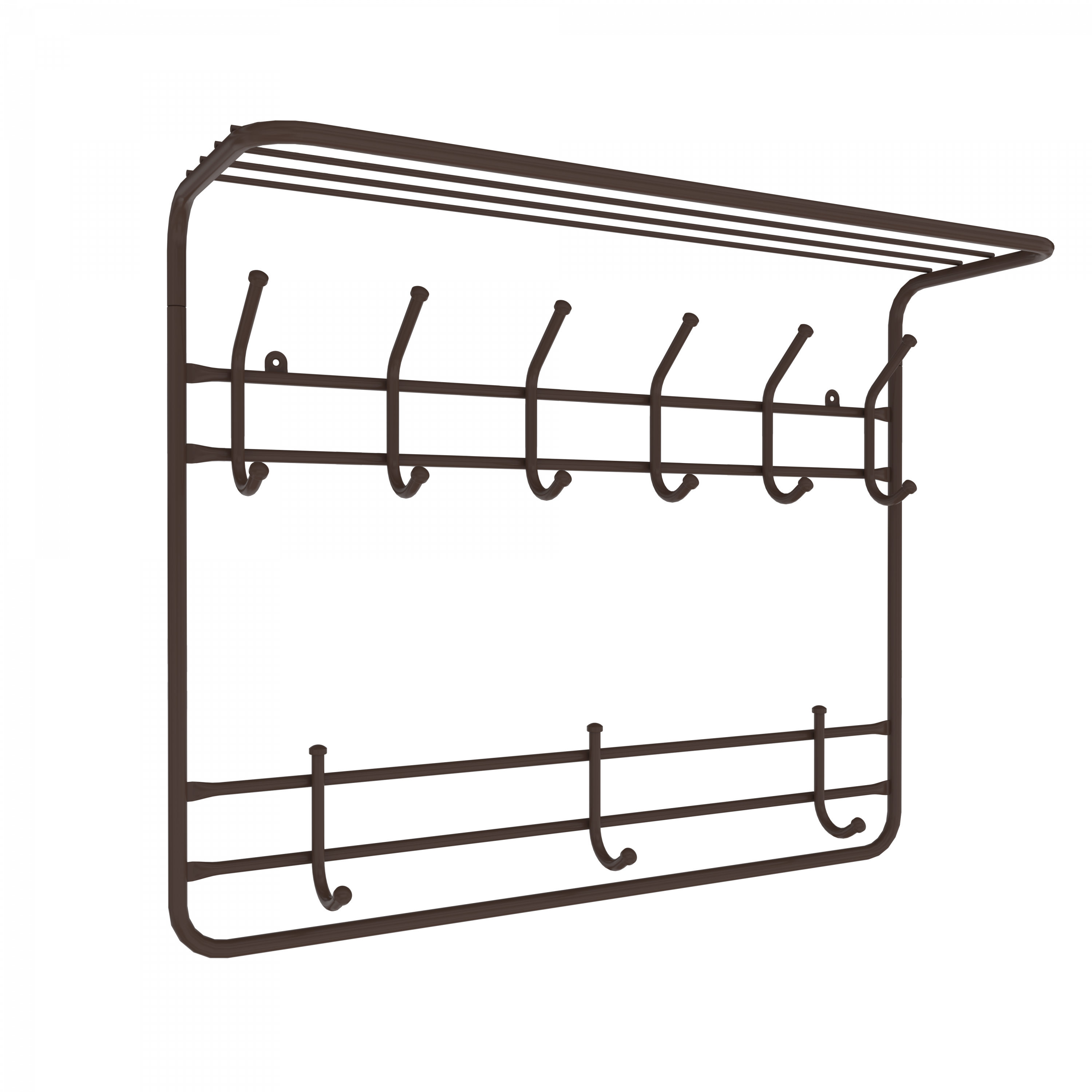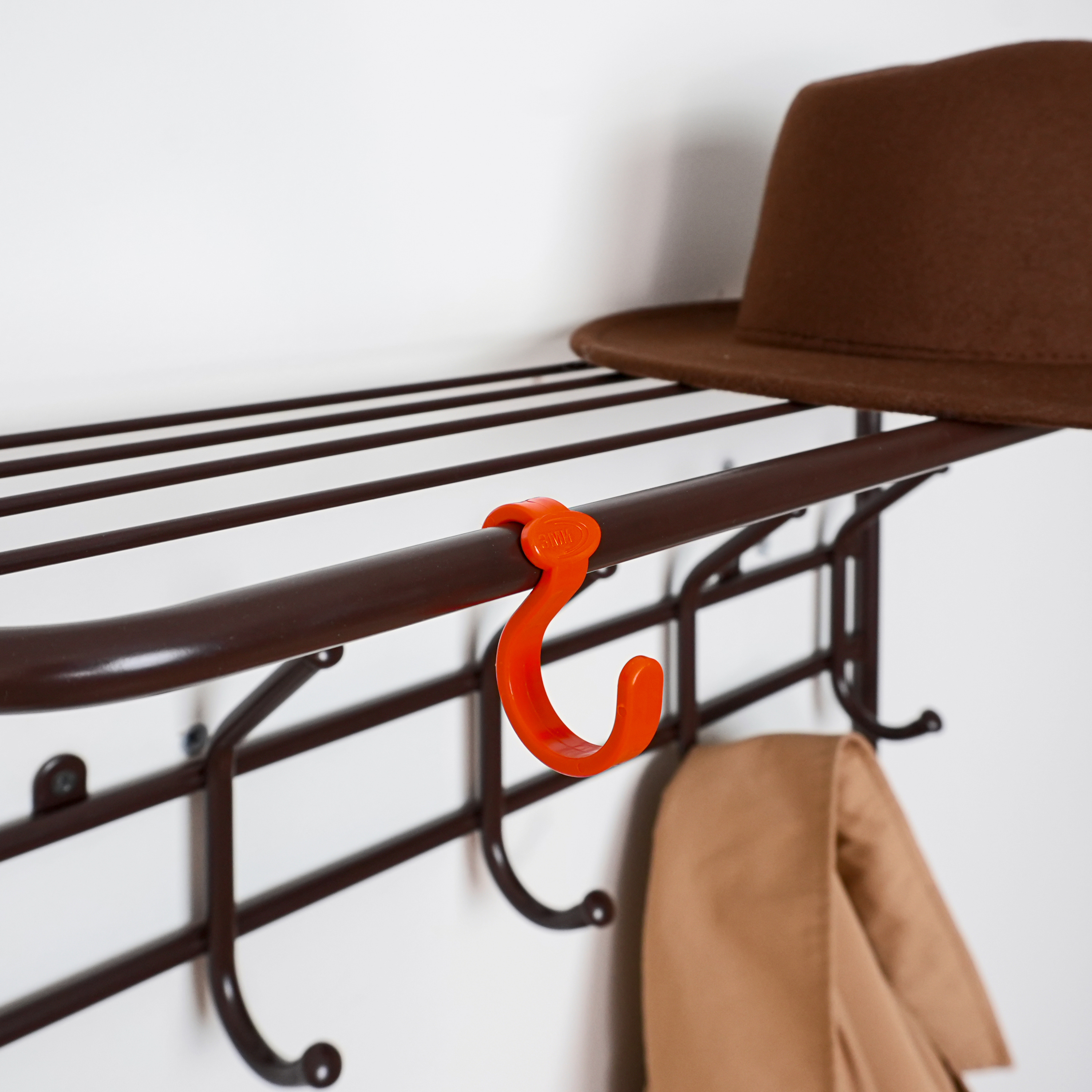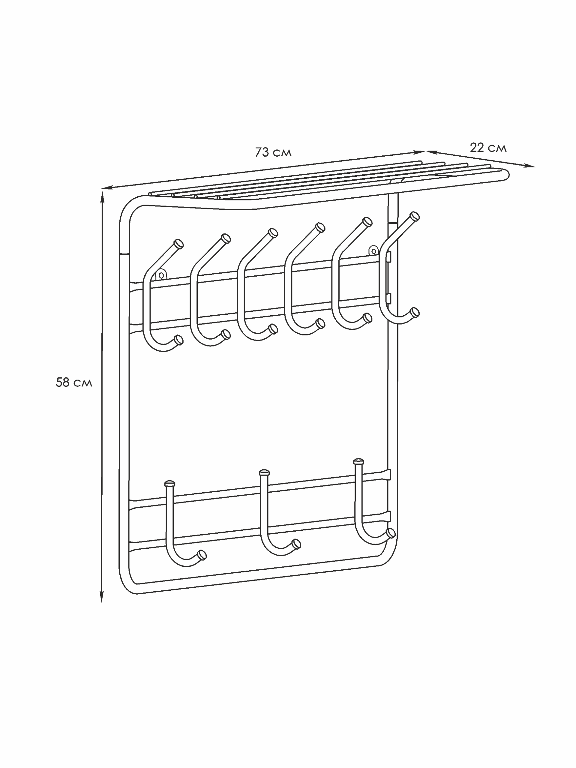 надежная сборно-разборная конструкция компактная 2-х ярусная вешалка с 9-ю крючками удобная полка для хранения головных уборов допустимая нагрузка до 5 кг на крючок Удобный пластиковый крючок для мелочей Расстояние между крепёжными отверстиями 625 мм