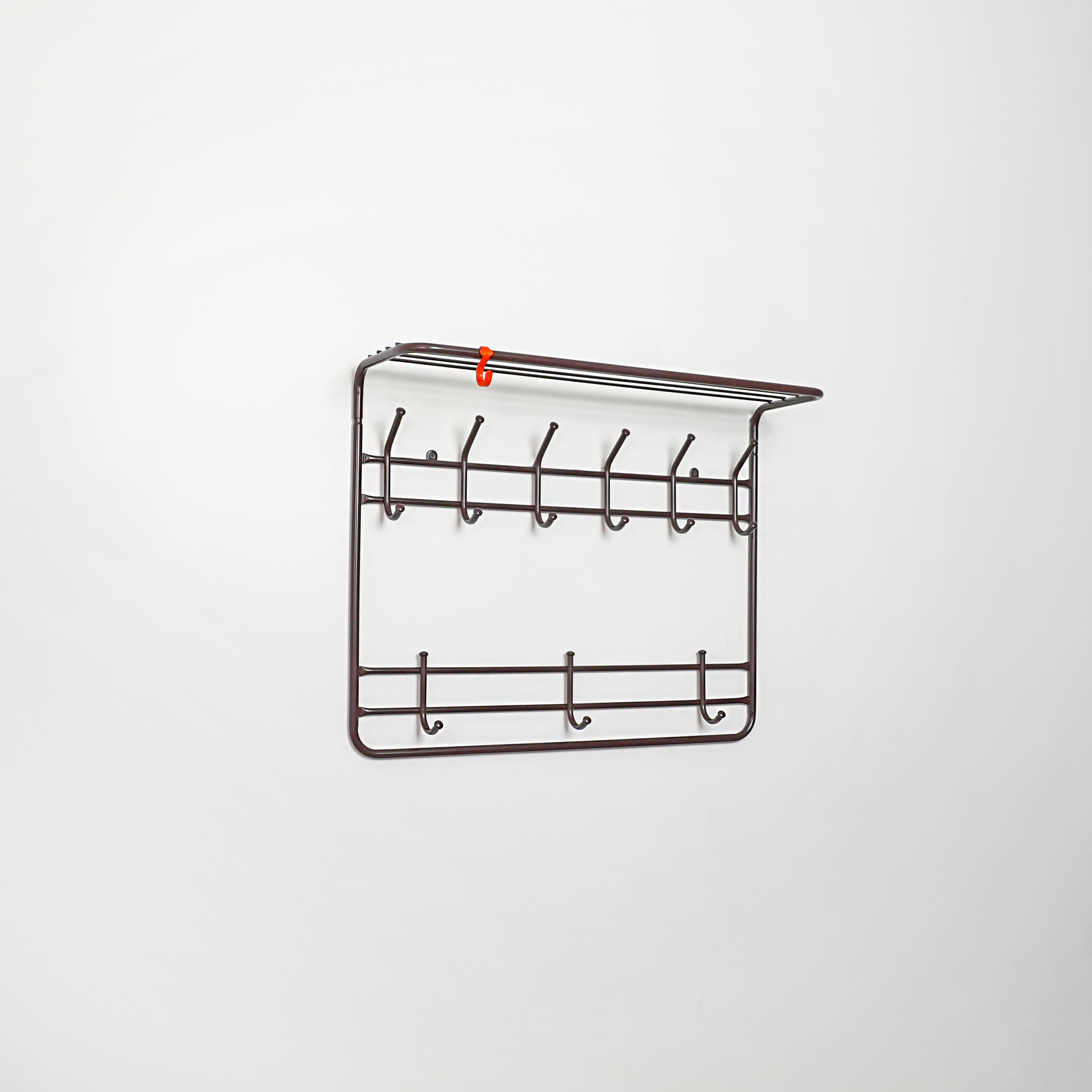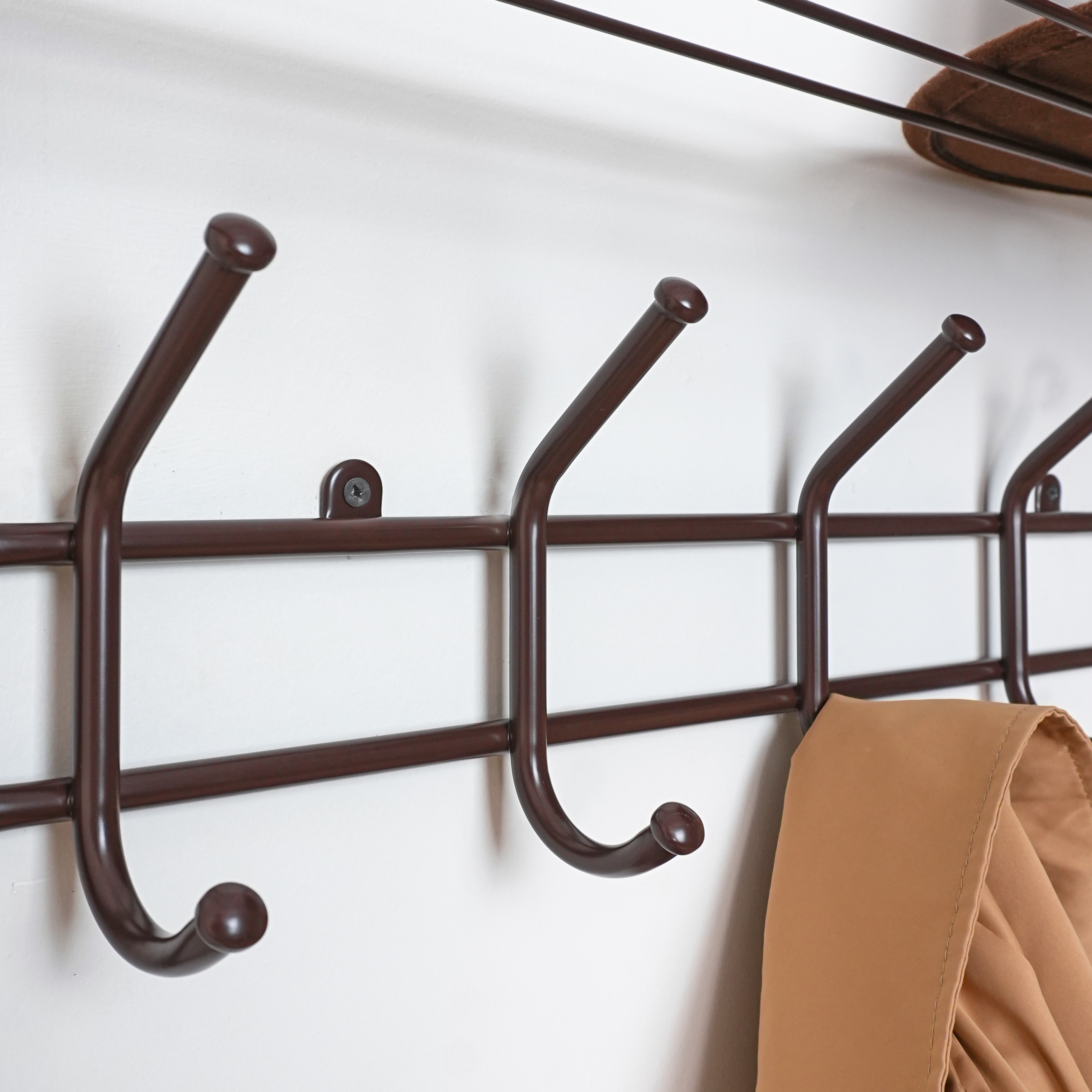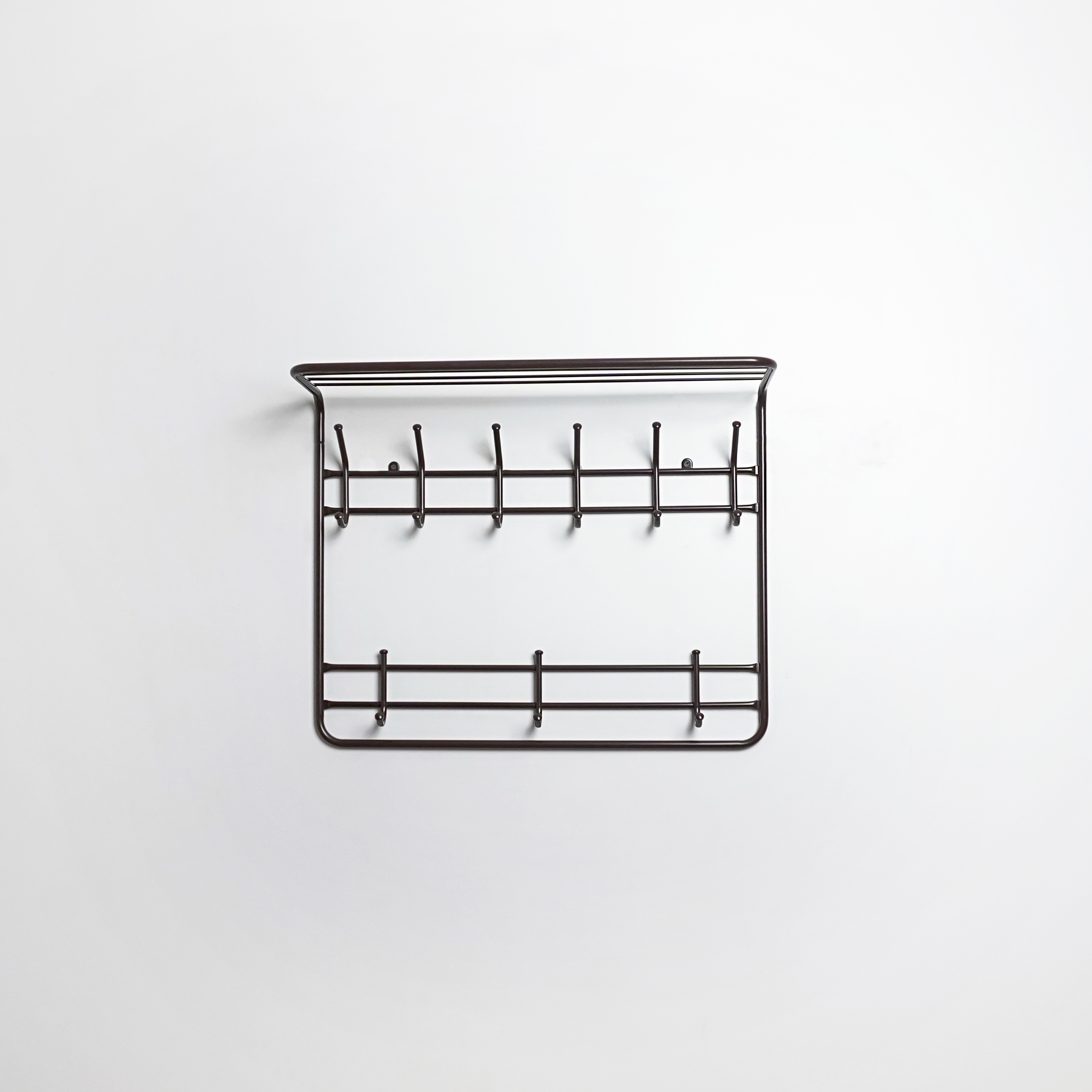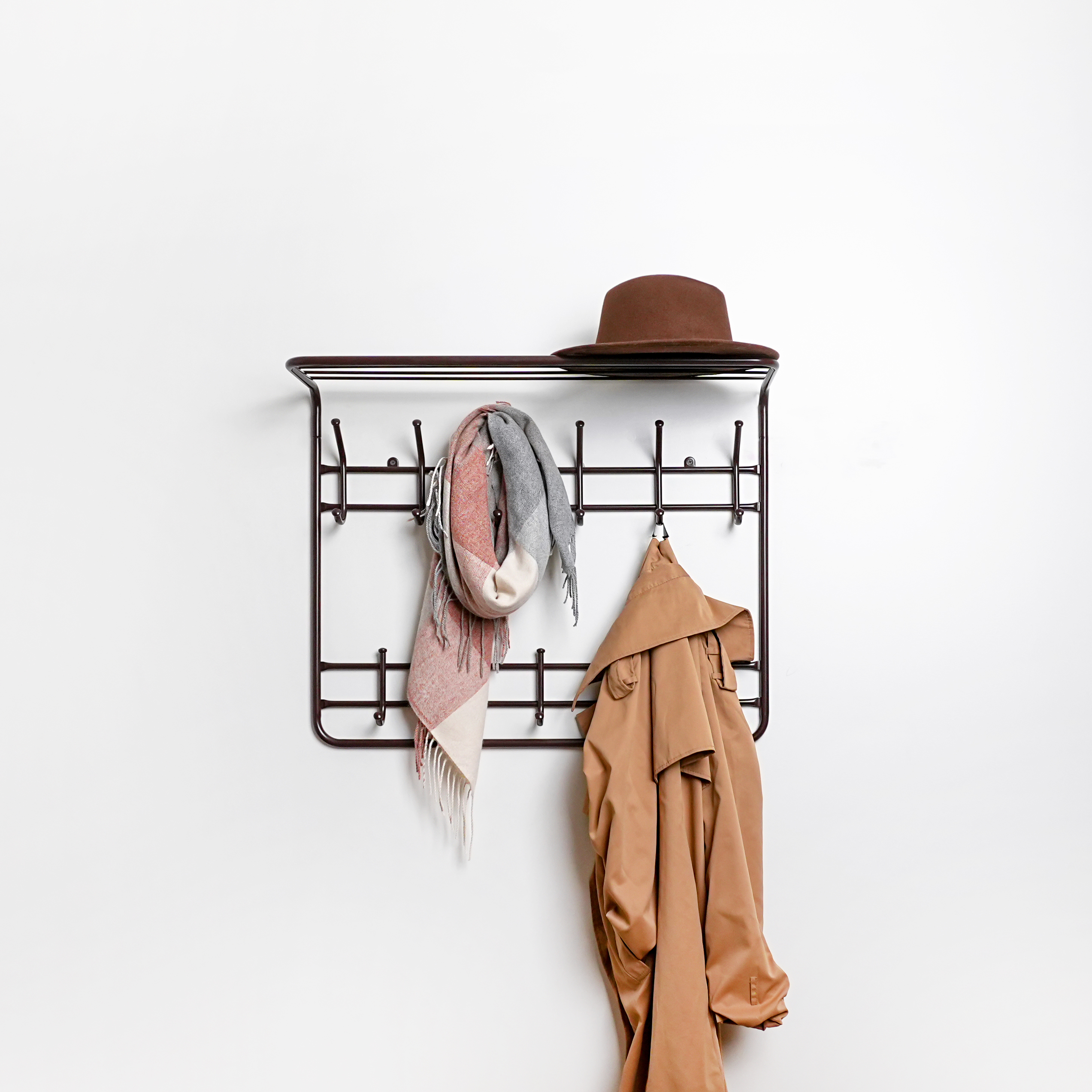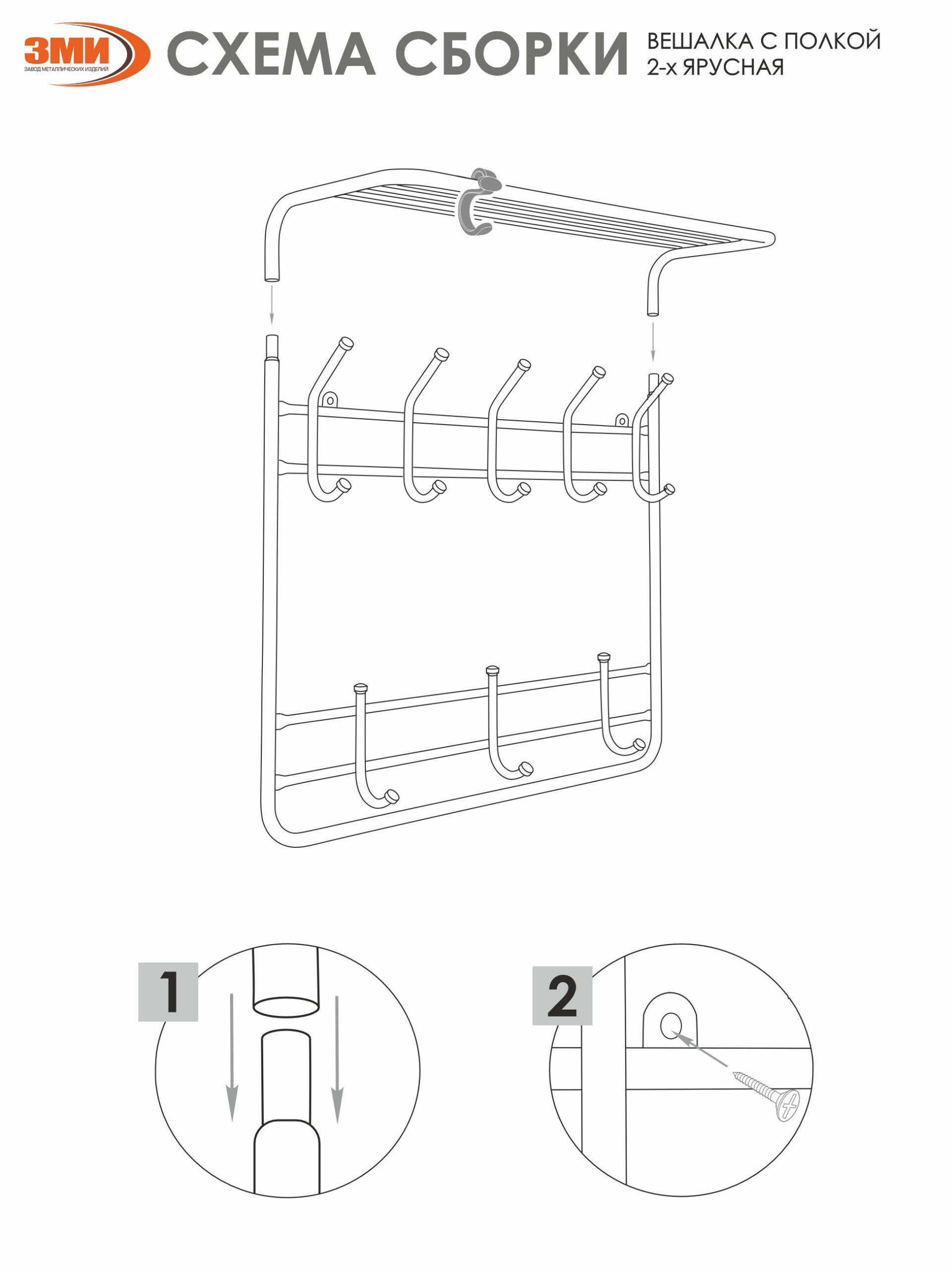 надежная сборно-разборная конструкция компактная 2-х ярусная вешалка с 9-ю крючками удобная полка для хранения головных уборов допустимая нагрузка до 5 кг на крючок Удобный пластиковый крючок для мелочей Расстояние между крепёжными отверстиями 625 мм
