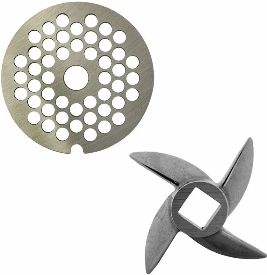 Набор комплектующих для мясорубки - нож и крупная решетка. Подходит как ручной (советской) мясорубки, так и для электрической, что делает ее универсальной насадкой для любого бытового прибора.