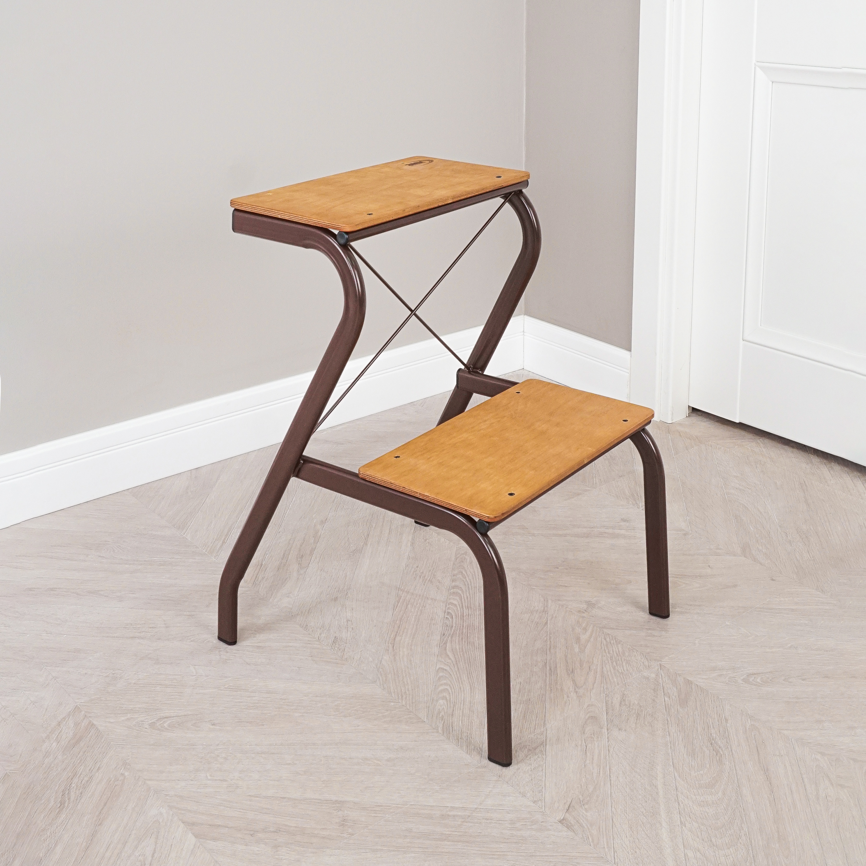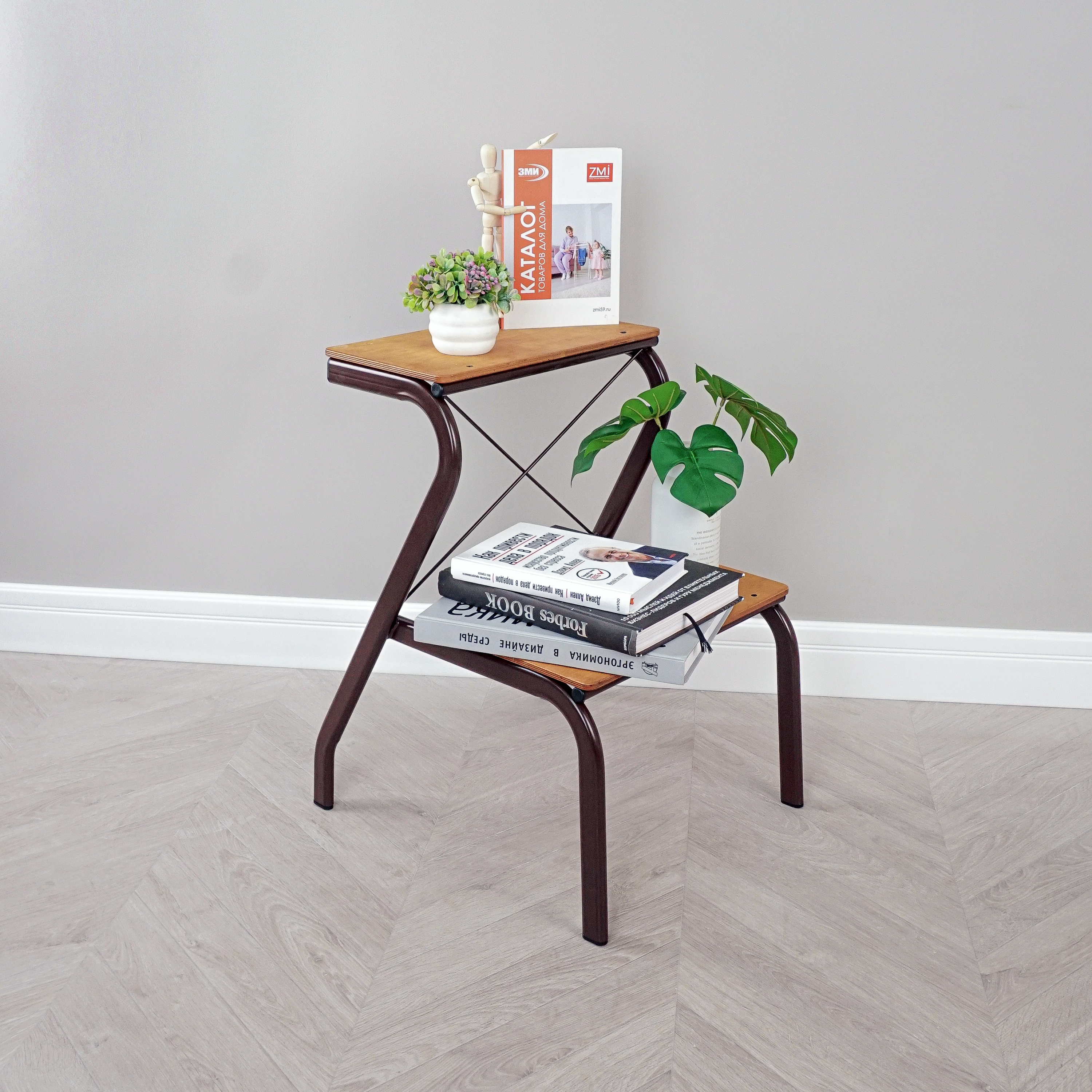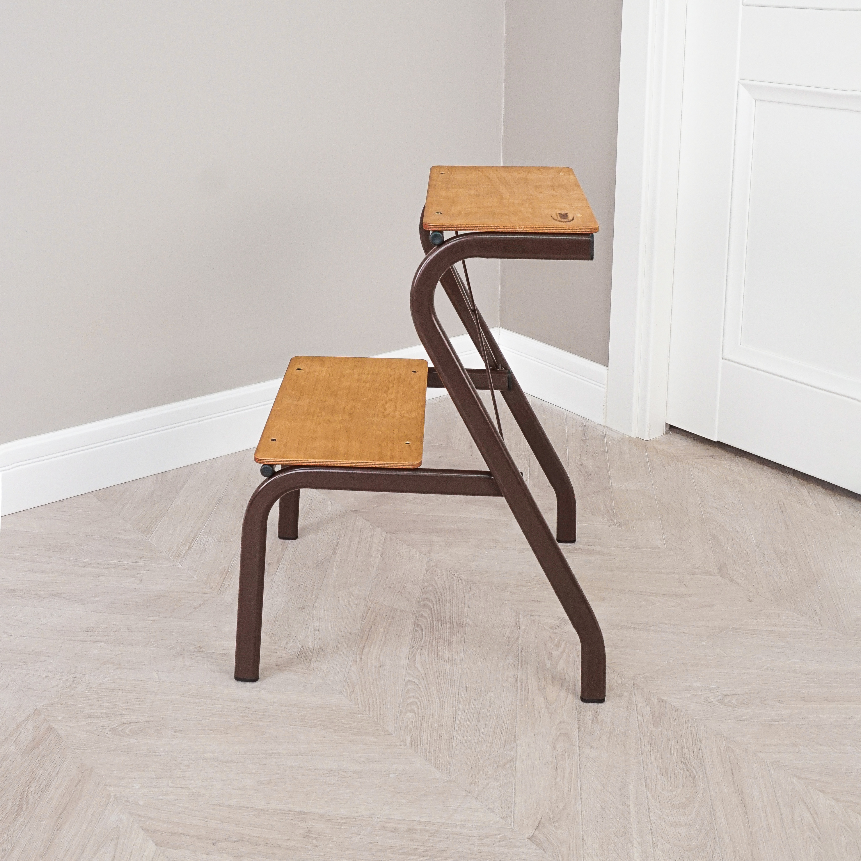 Табурет-стремянка имеет цельносварной каркас из трубы и проволоки с прикрученными к нему на саморезы ступеньками из фанеры.