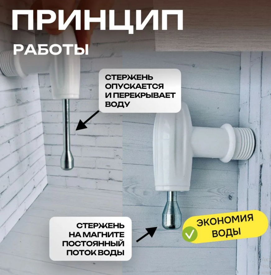 При полном нажатии, стержень крана залипает на магните и получается постоянный поток воды. При неполном нажатии на стержень он опускается и перекрывает воду, когда на него перестают давить. Пластиковый кран с магнитным стержнем позволяет существенно экономить воду, а так же служит намного дольше чем любые поворотные краны благодаря простоте и надежности конструкции.